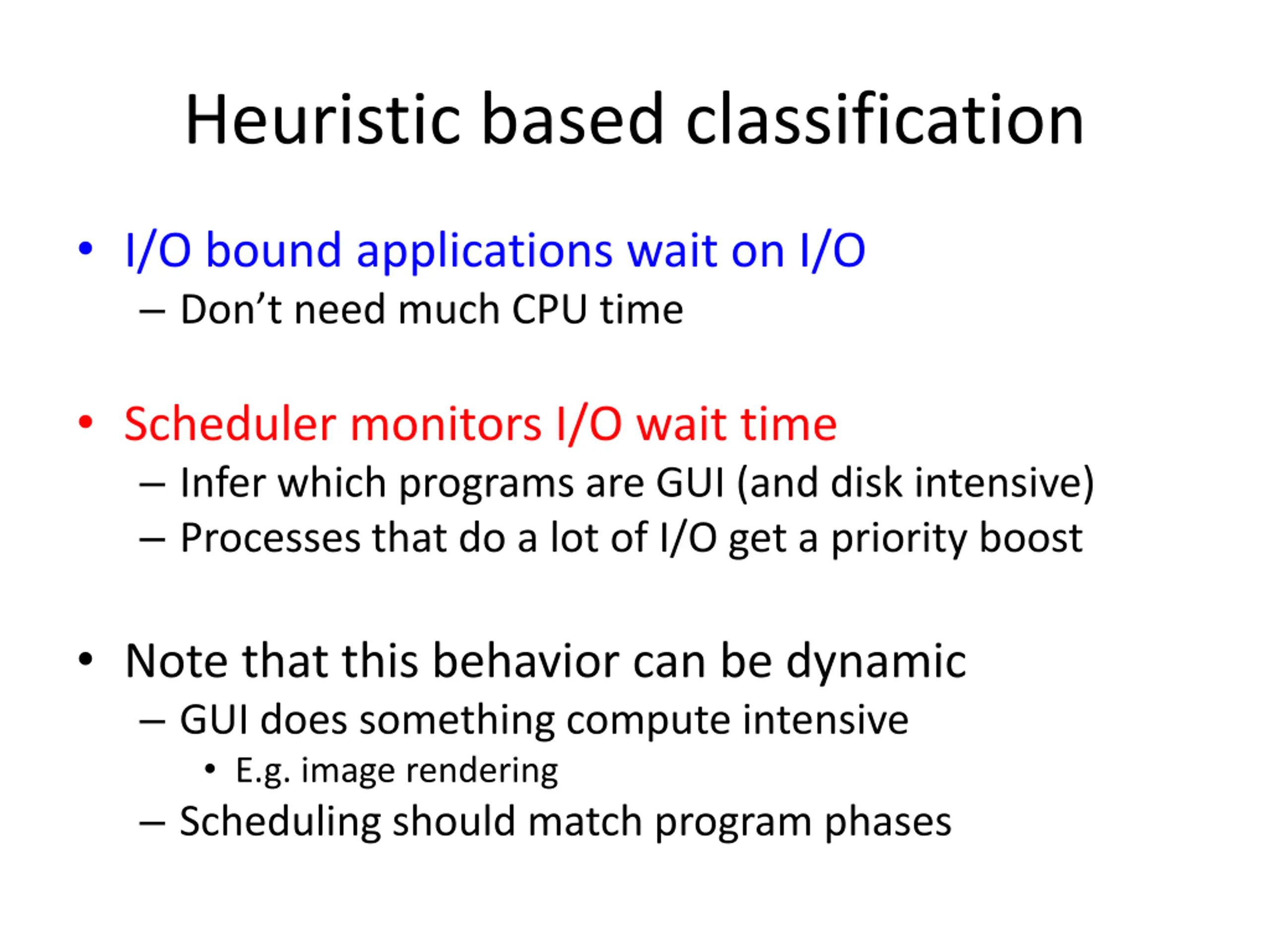 Heuristic based classification I/O bound applications wait on I/O Don t need much CPU time Scheduler monitors I/O wait time Infer which programs are GUI (and disk intensive) Processes that do a lot of I/O get a priority boost Note that this behavior can be dynamic GUI does something compute intensive E.g. image rendering Scheduling should match program phases