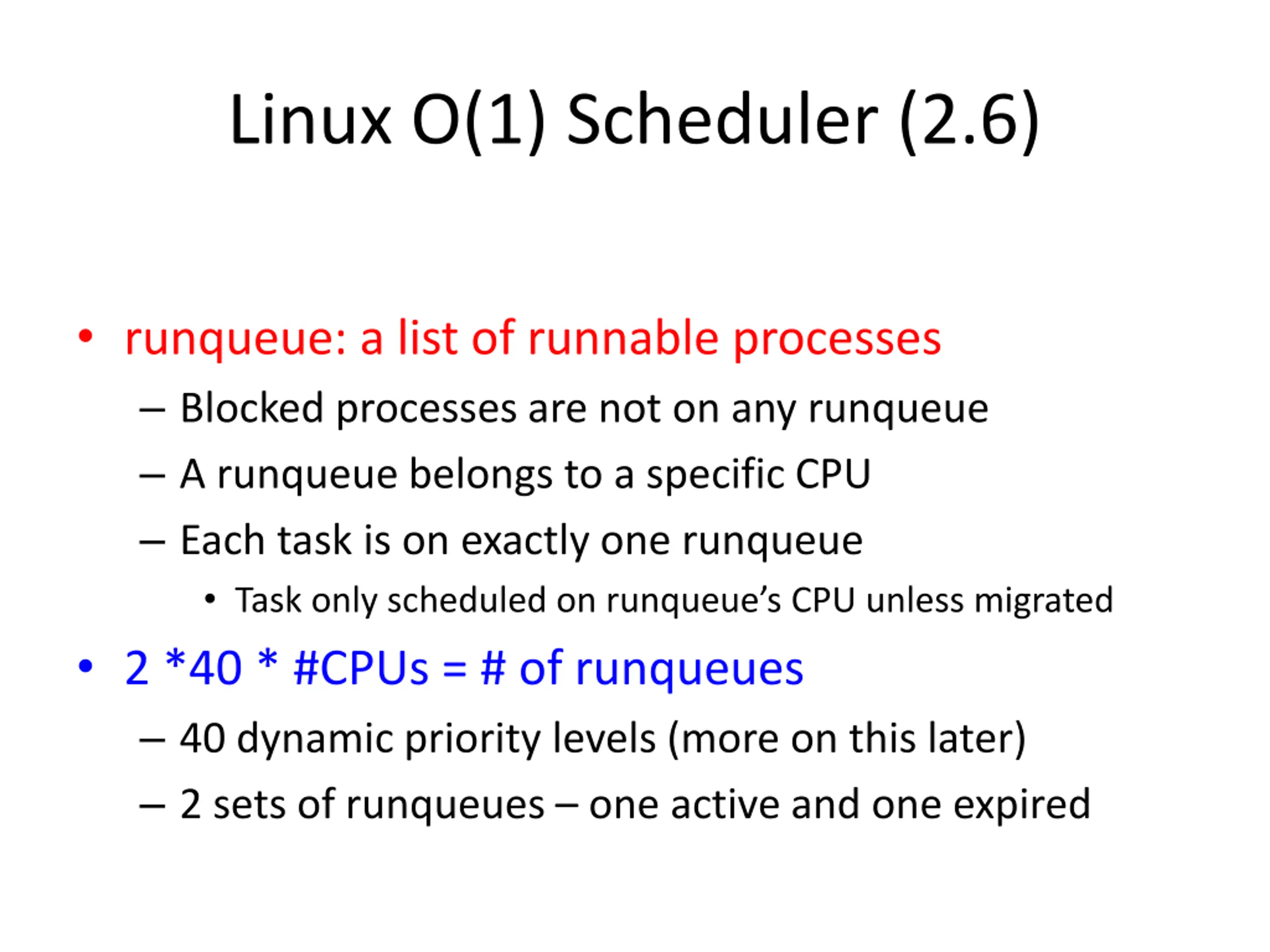 Linux O(1) Scheduler (2.6) runqueue: a list of runnable processes Blocked processes are not on any runqueue A runqueue belongs to a specific CPU Each task is on exactly one runqueue Task only scheduled on runqueue s CPU unless migrated 2 *40 * #CPUs = # of runqueues 40 dynamic priority levels (more on this later) 2 sets of runqueues one active and one expired