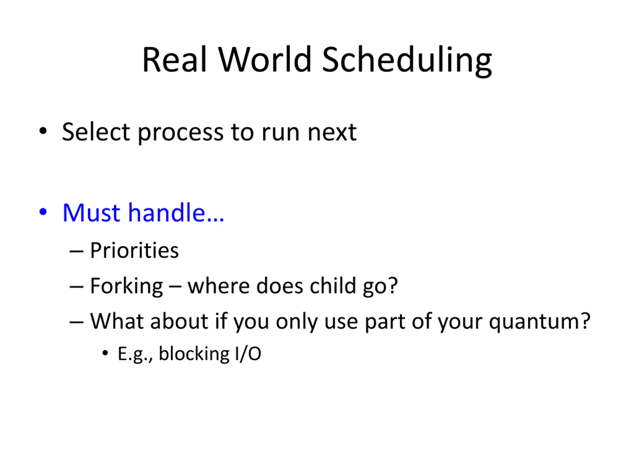 Real World Scheduling Select process to run next Must handle Priorities Forking where does child go? What about if you only use part of your quantum? E.g., blocking I/O