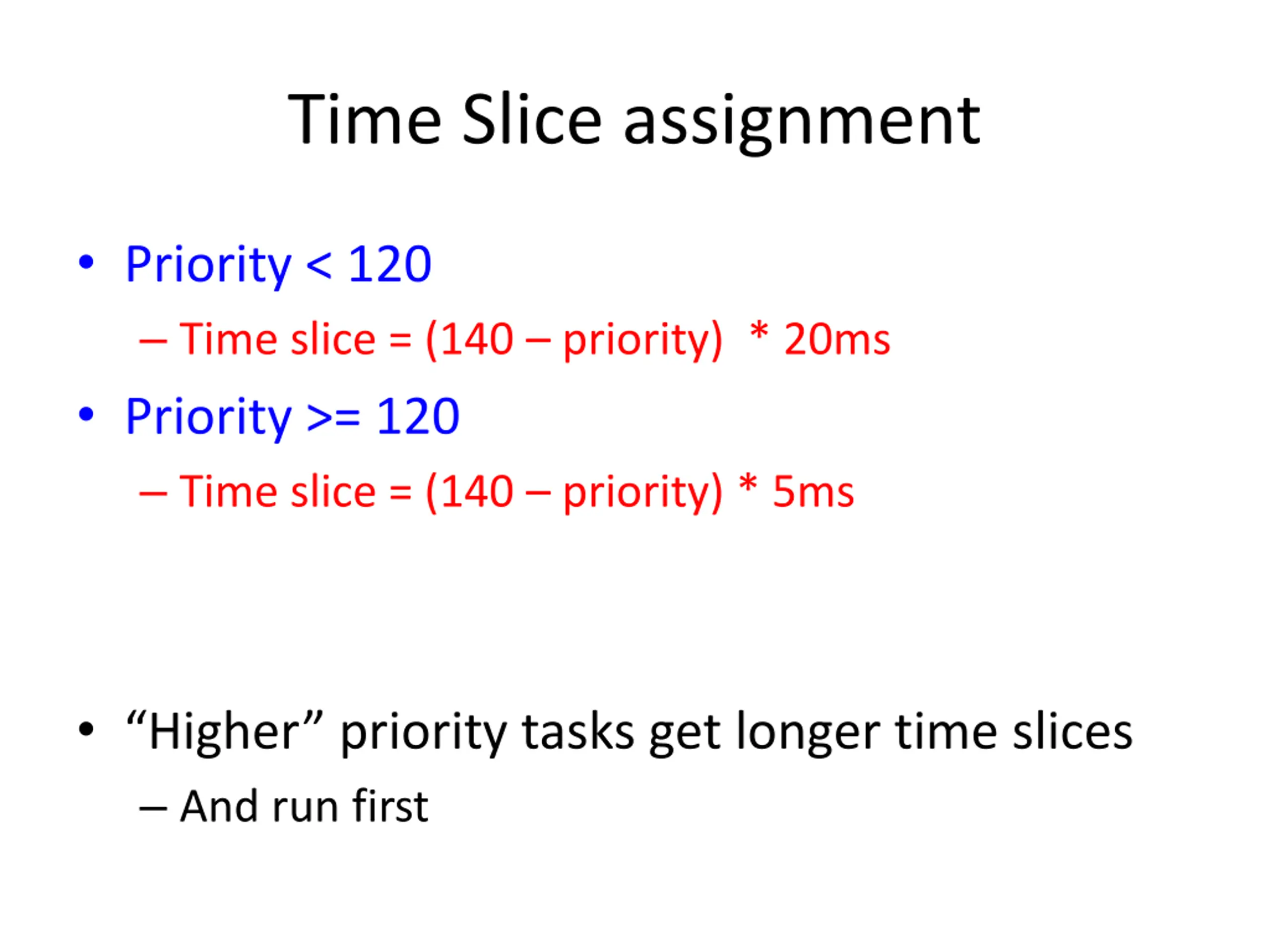 Time Slice assignment Priority < 120 Time slice = (140 priority) * 20ms Priority >= 120 Time slice = (140 priority) * 5ms Higher priority tasks get longer time slices And run first