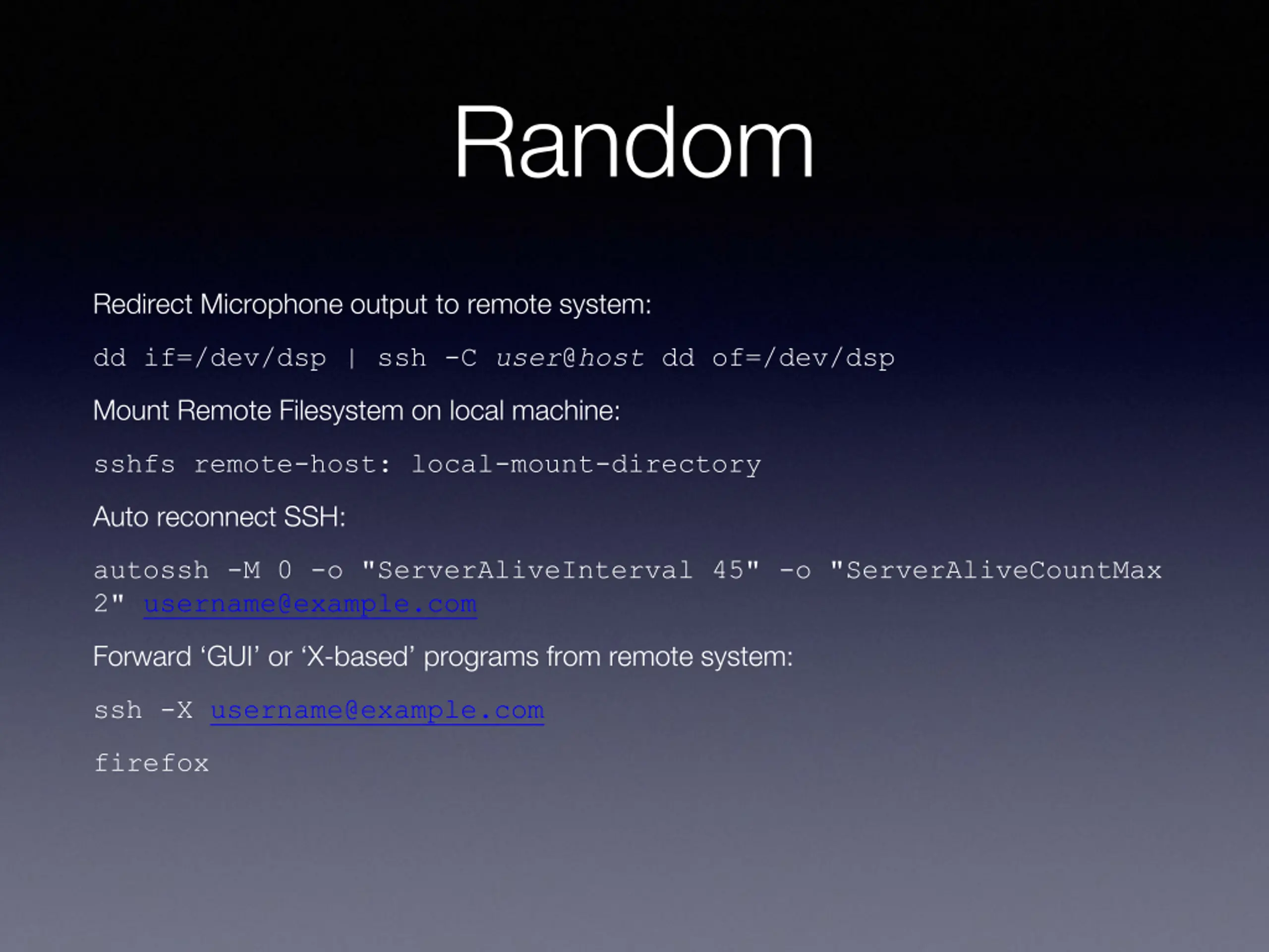 Random Redirect Microphone output to remote system: dd if=/dev/dsp | ssh -C user@host dd of=/dev/dsp Mount Remote Filesystem on local machine: sshfs remote-host: local-mount-directory Auto reconnect SSH: autossh -M 0 -o "ServerAliveInterval 45" -o "ServerAliveCountMax 2" username@example.com Forward GUI or X-based programs from remote system: ssh -X username@example.com firefox