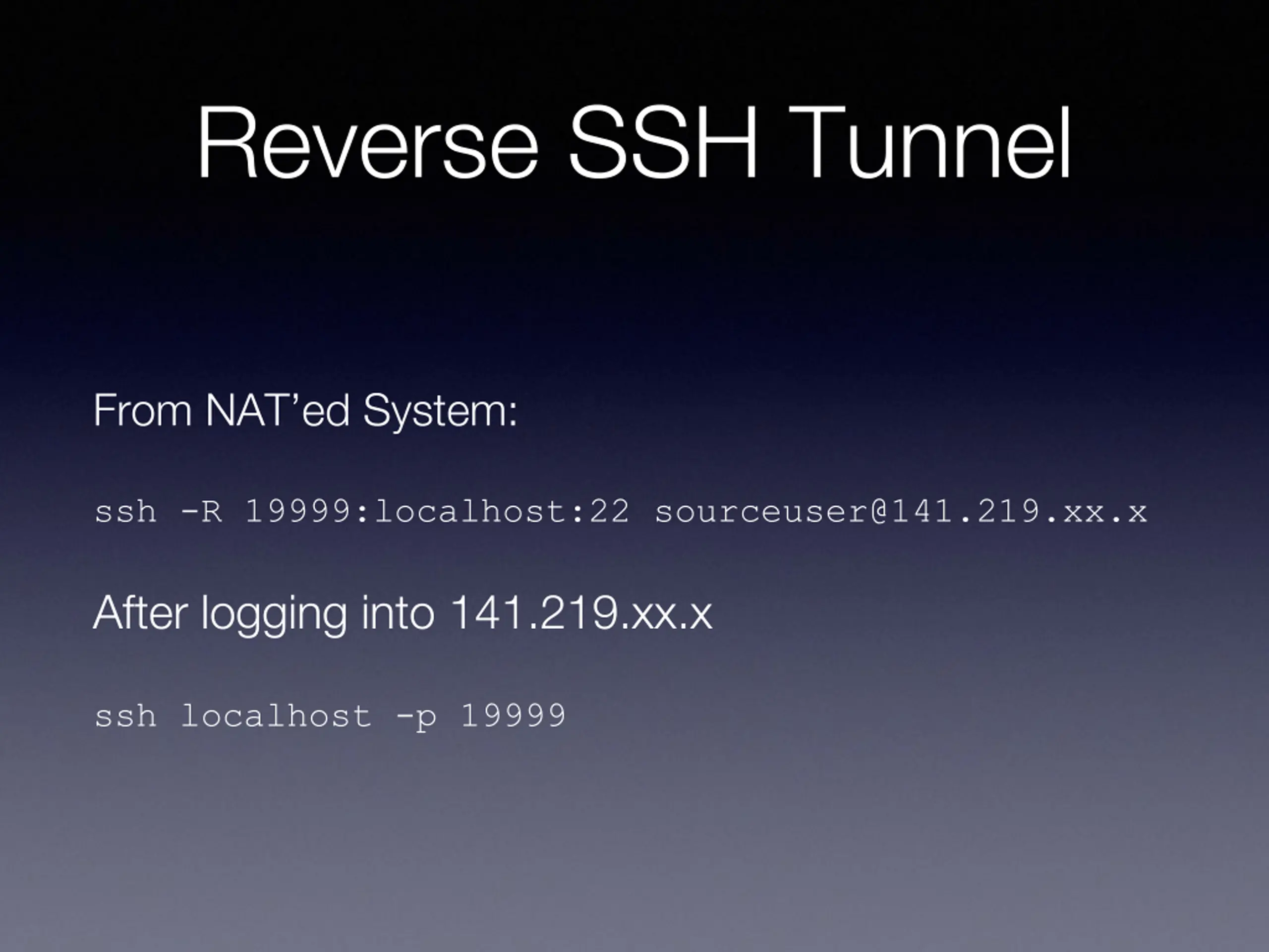 Reverse SSH Tunnel From NAT ed System: ssh -R 19999:localhost:22 sourceuser@141.219.xx.x After logging into 141.219.xx.x ssh localhost -p 19999