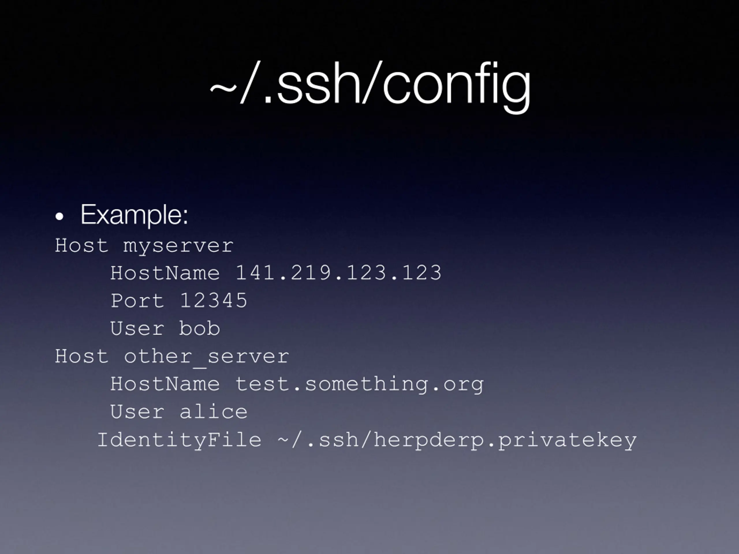 ~/.ssh/config Example: Host myserver HostName 141.219.123.123 Port 12345 User bob Host other_server HostName test.something.org User alice IdentityFile ~/.ssh/herpderp.privatekey