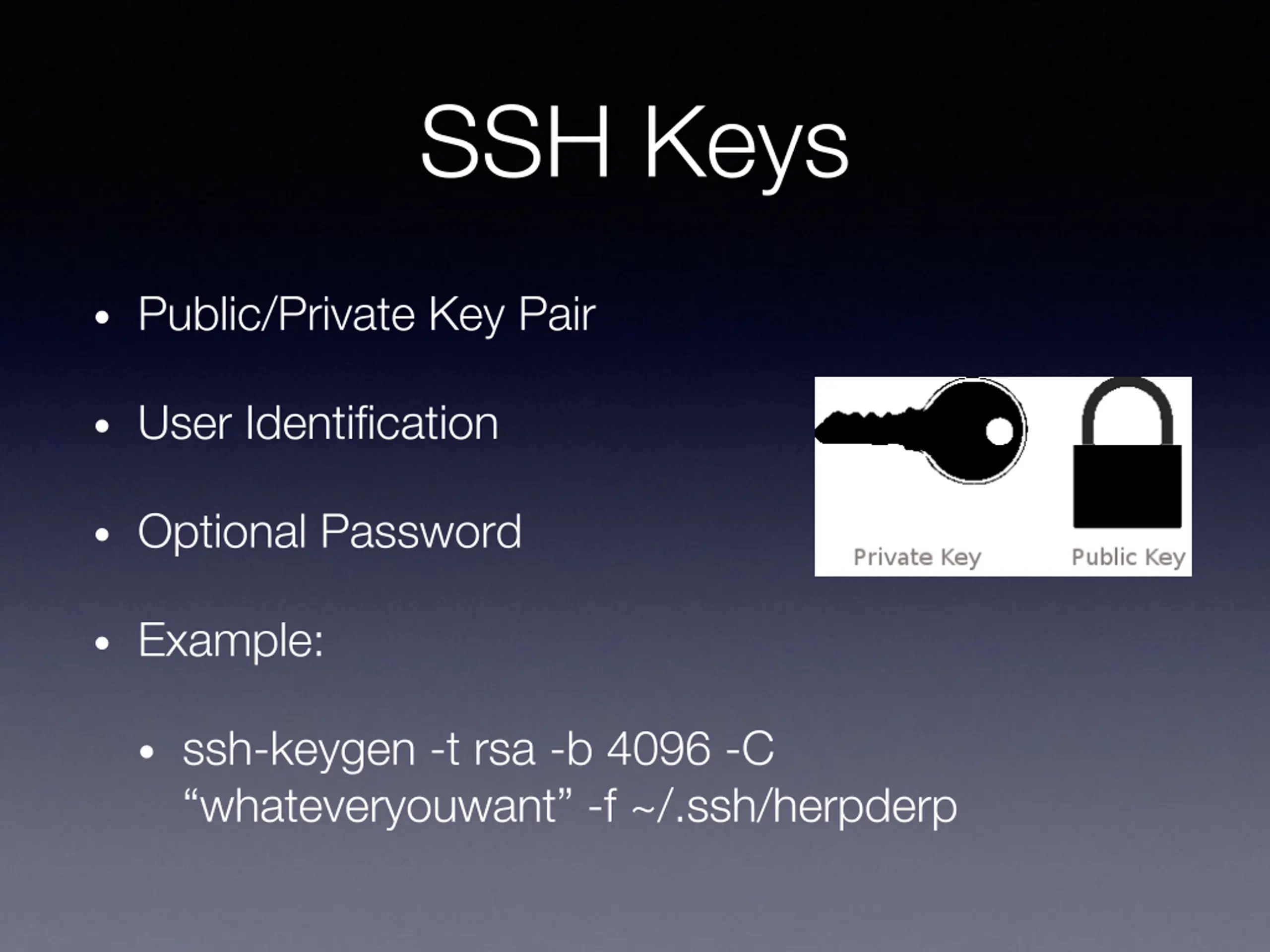 SSH Keys Public/Private Key Pair User Identification Optional Password Example: ssh-keygen -t rsa -b 4096 -C whateveryouwant -f ~/.ssh/herpderp