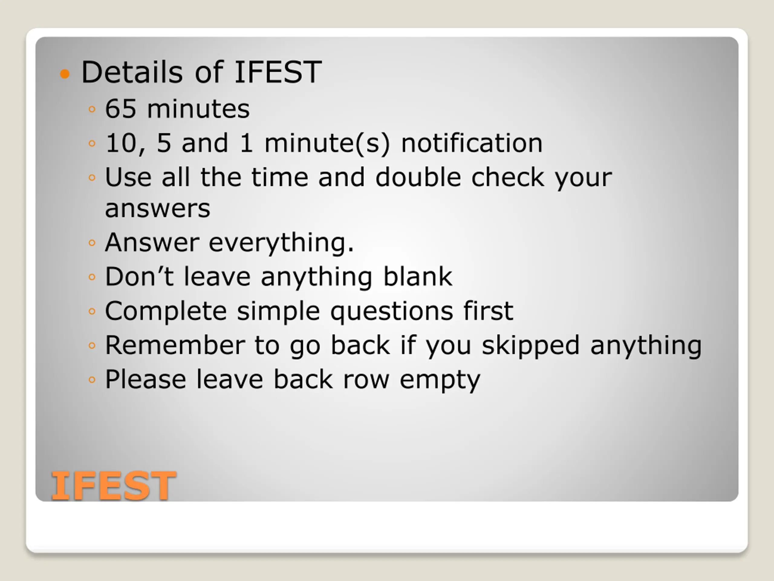 Details of IFEST 65 minutes 10, 5 and 1 minute(s) notification Use all the time and double check your answers Answer everything. Don t leave anything blank Complete simple questions first Remember to go back if you skipped anything Please leave back row empty IFEST