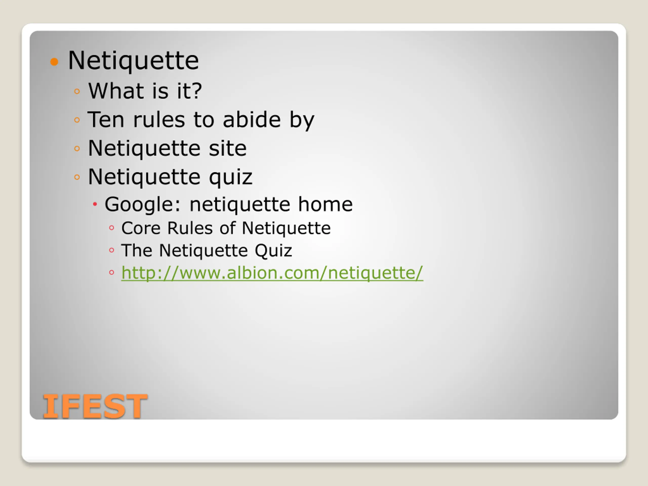 Netiquette What is it? Ten rules to abide by Netiquette site Netiquette quiz Google: netiquette home Core Rules of Netiquette The Netiquette Quiz http://www.albion.com/netiquette/ IFEST