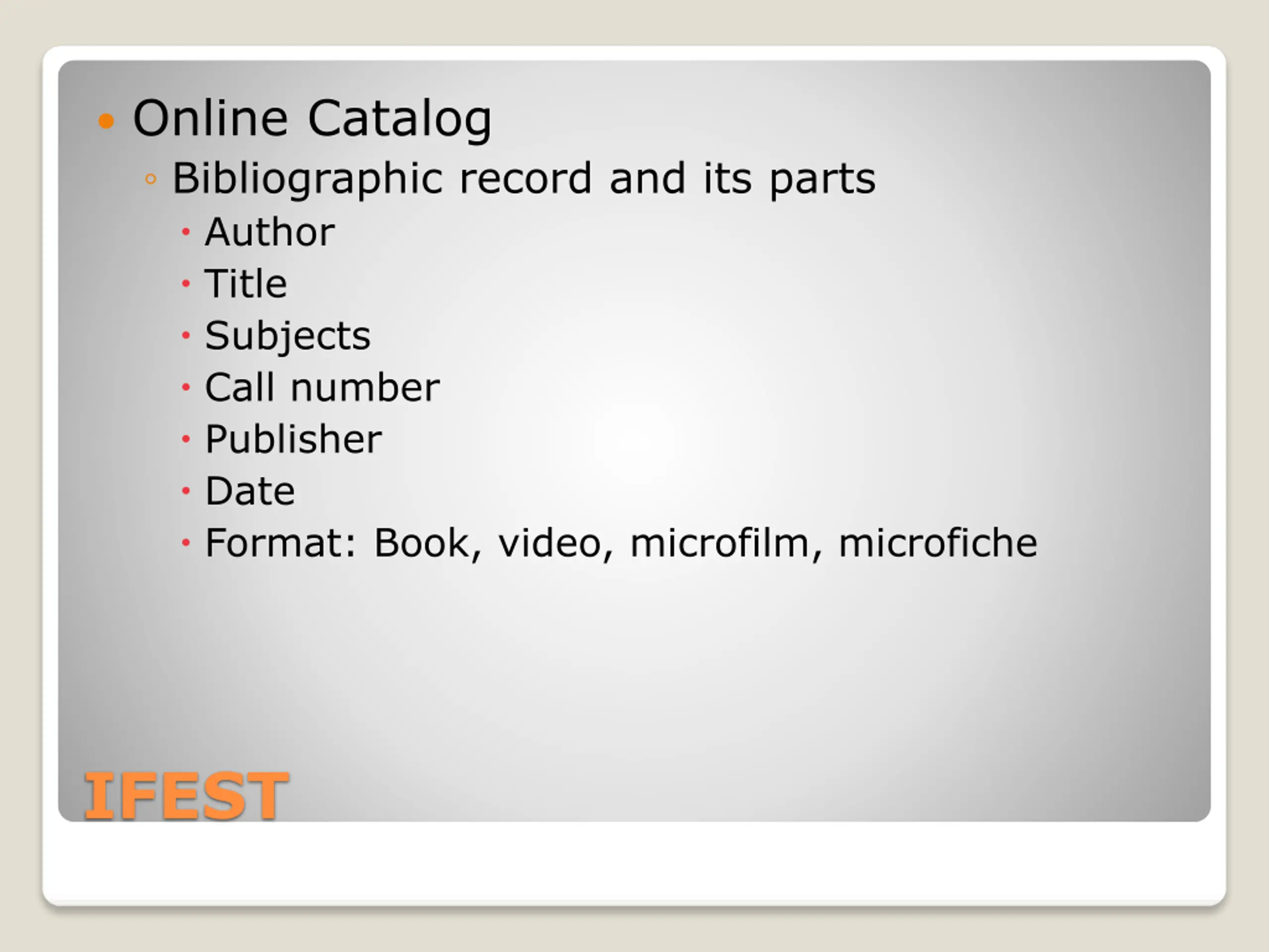 Online Catalog OPAC Electronic catalog Contains everything that is located in the library Books, videos, cd s, dvd s, magazine titles, ebooks (Not articles) Search by subject, title, author keyword IFEST