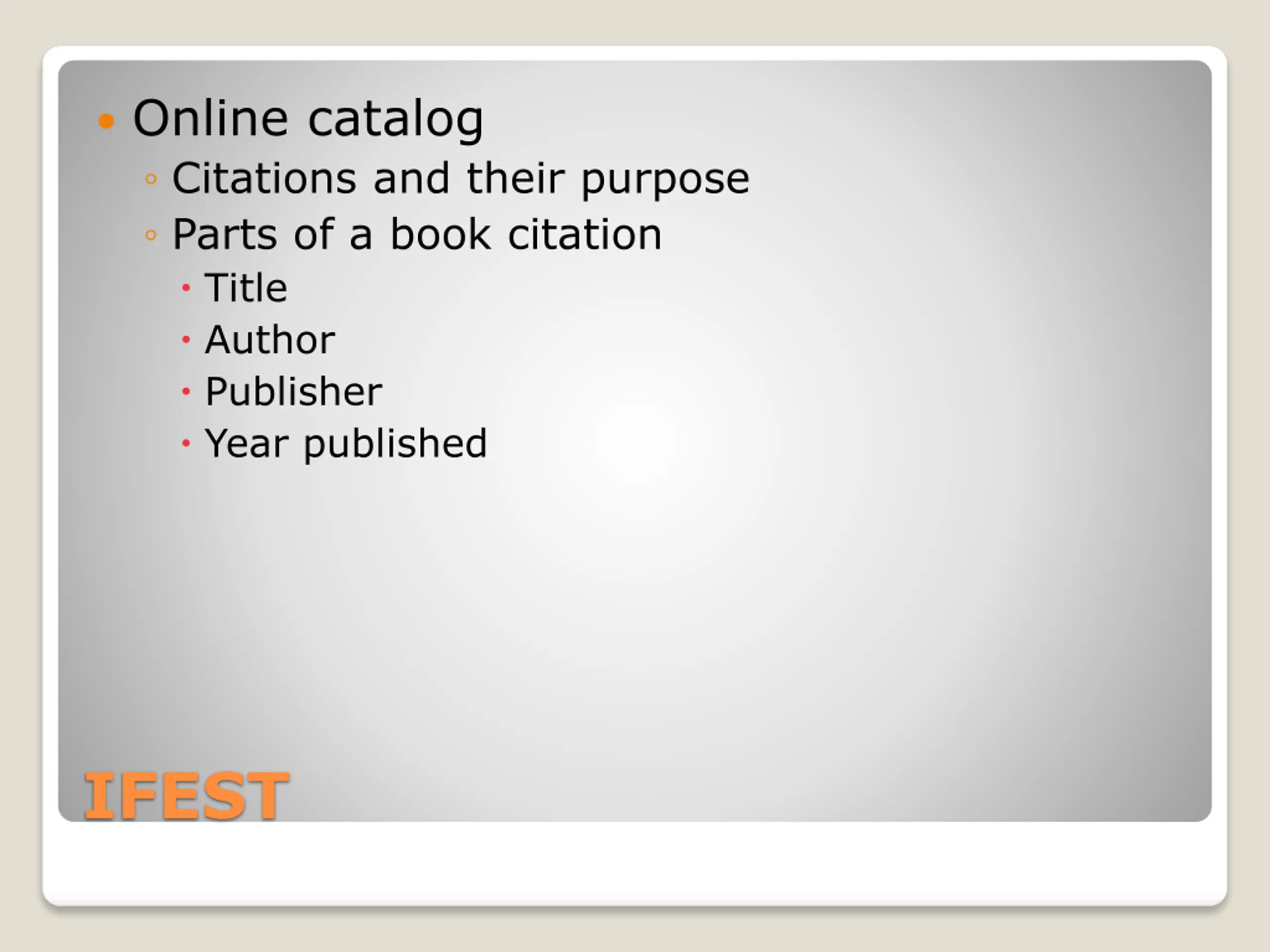 Online catalog Citations and their purpose Parts of a book citation Title Author Publisher Year published IFEST