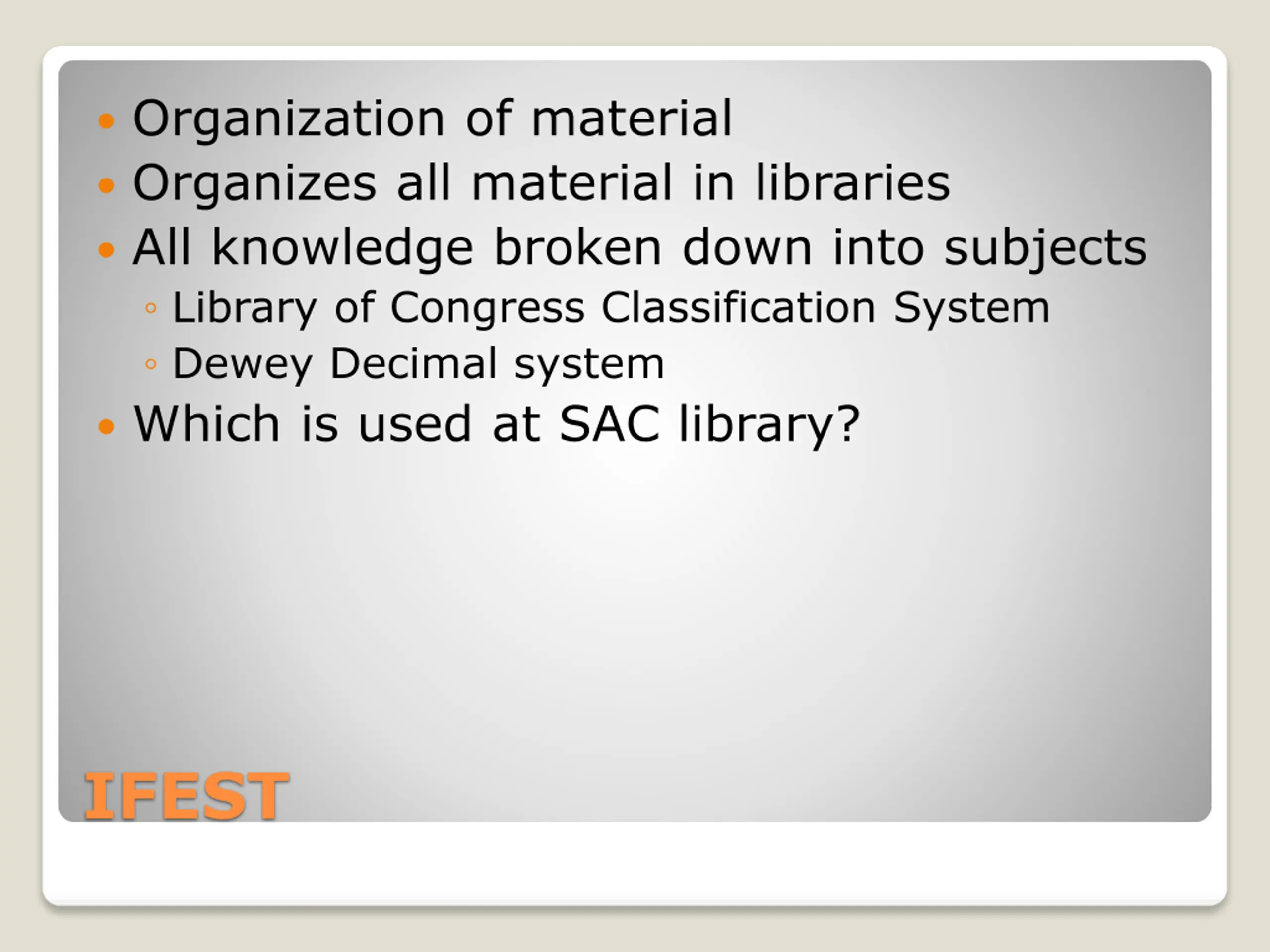 Organization of material Organizes all material in libraries All knowledge broken down into subjects Library of Congress Classification System Dewey Decimal system Which is used at SAC library? IFEST