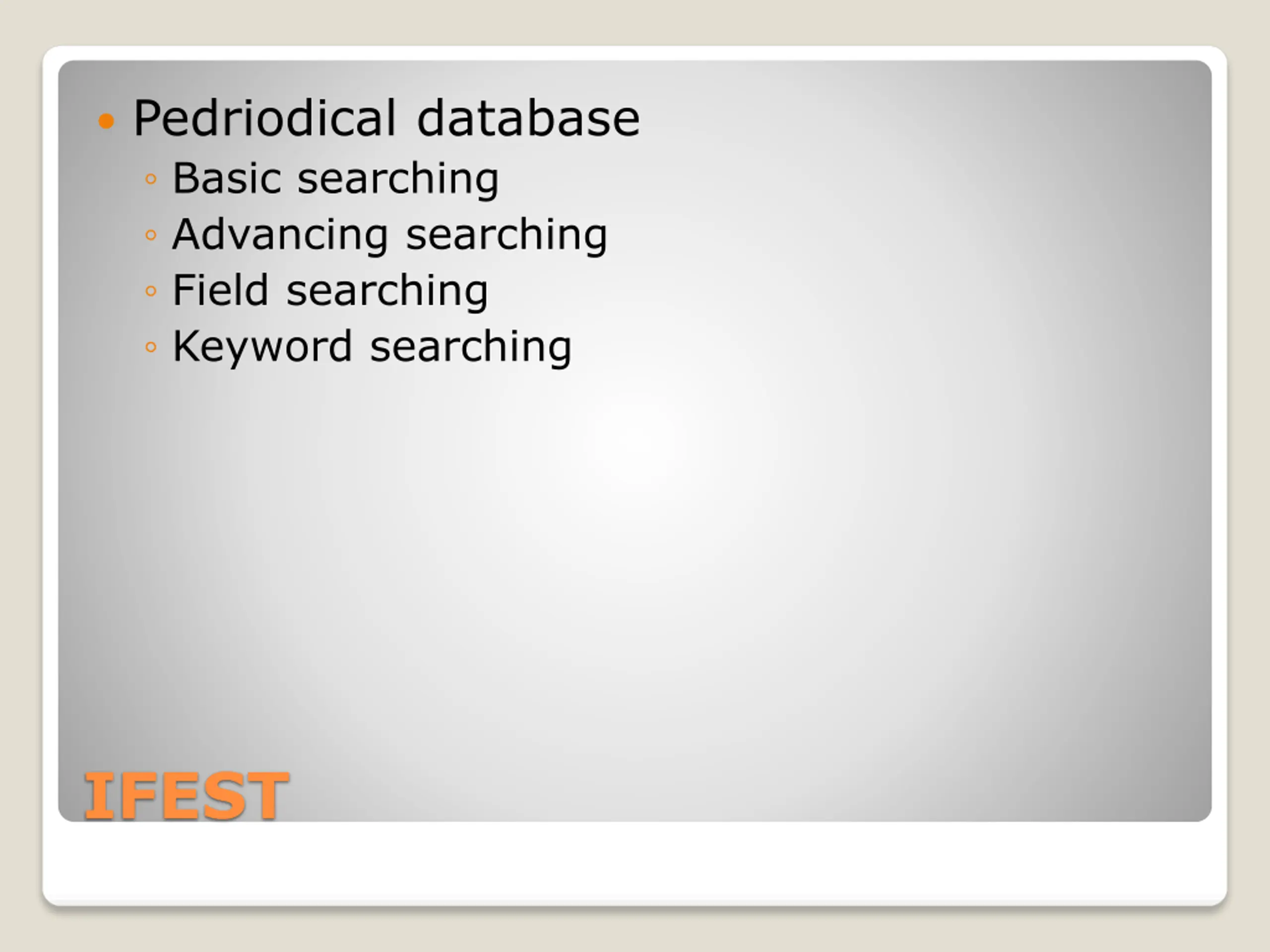 Pedriodical database Basic searching Advancing searching Field searching Keyword searching IFEST