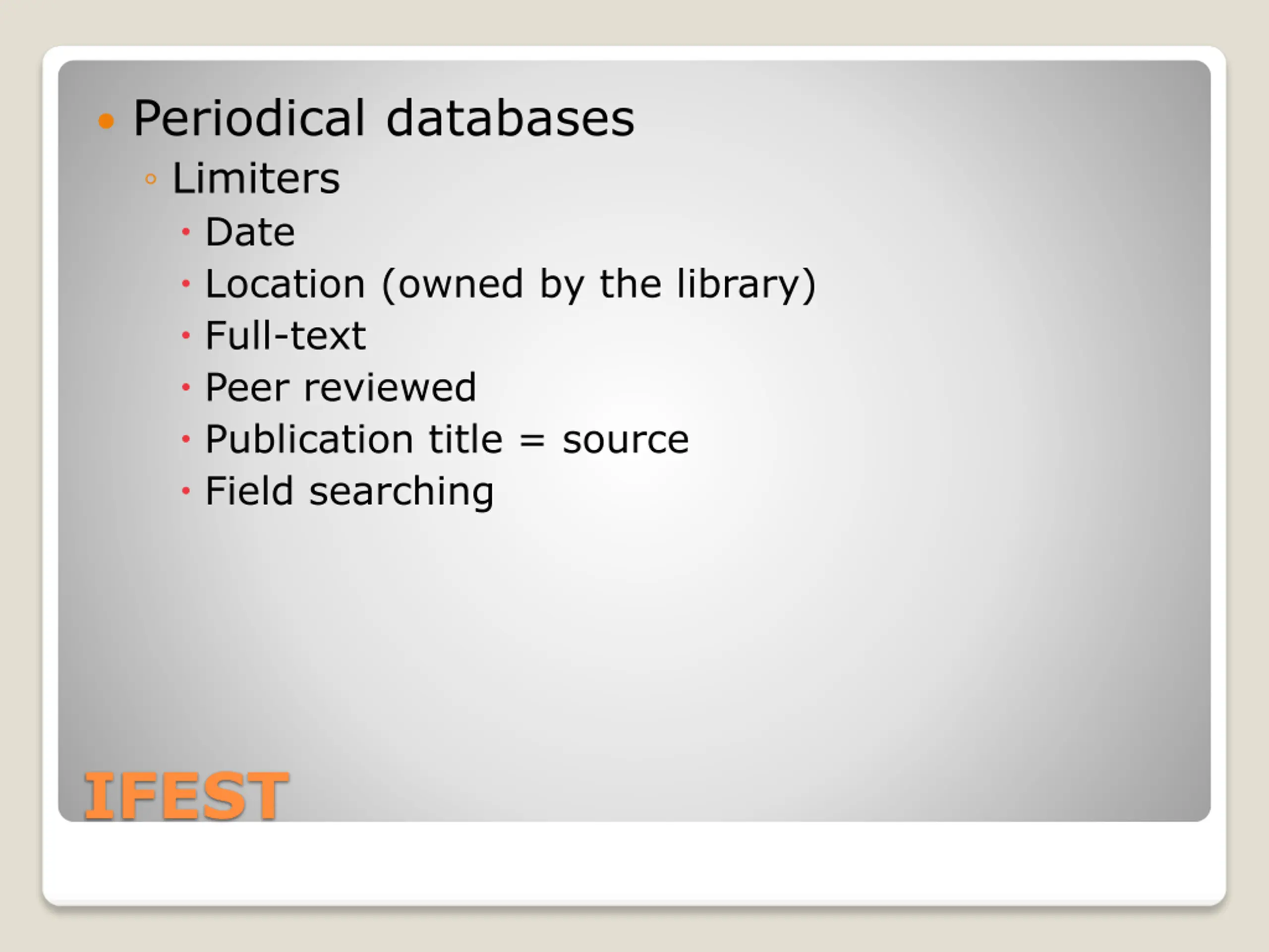 Periodical databases Limiters Date Location (owned by the library) Full-text Peer reviewed Publication title = source Field searching IFEST
