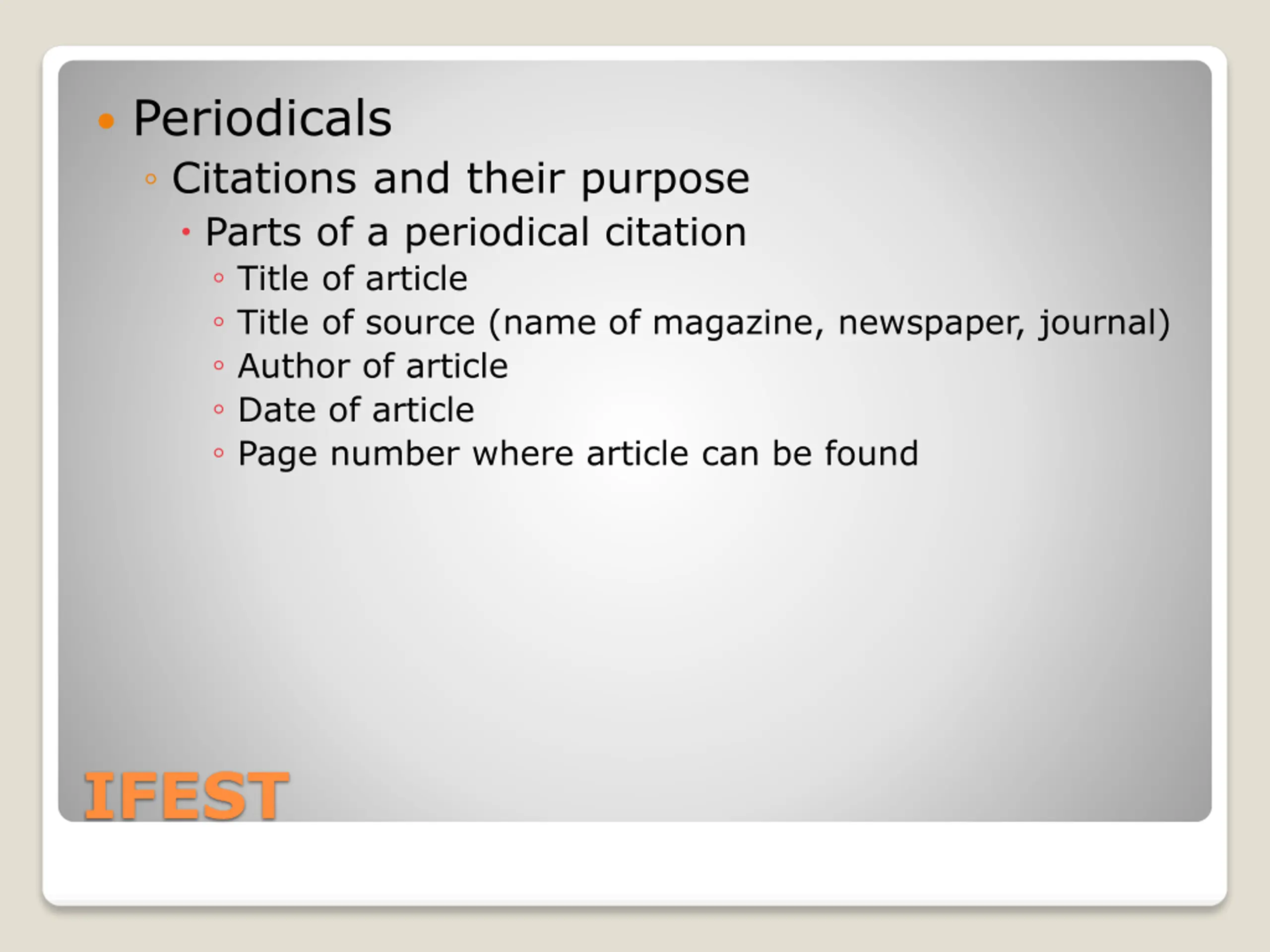Periodicals Citations and their purpose Parts of a periodical citation Title of article Title of source (name of magazine, newspaper, journal) Author of article Date of article Page number where article can be found IFEST