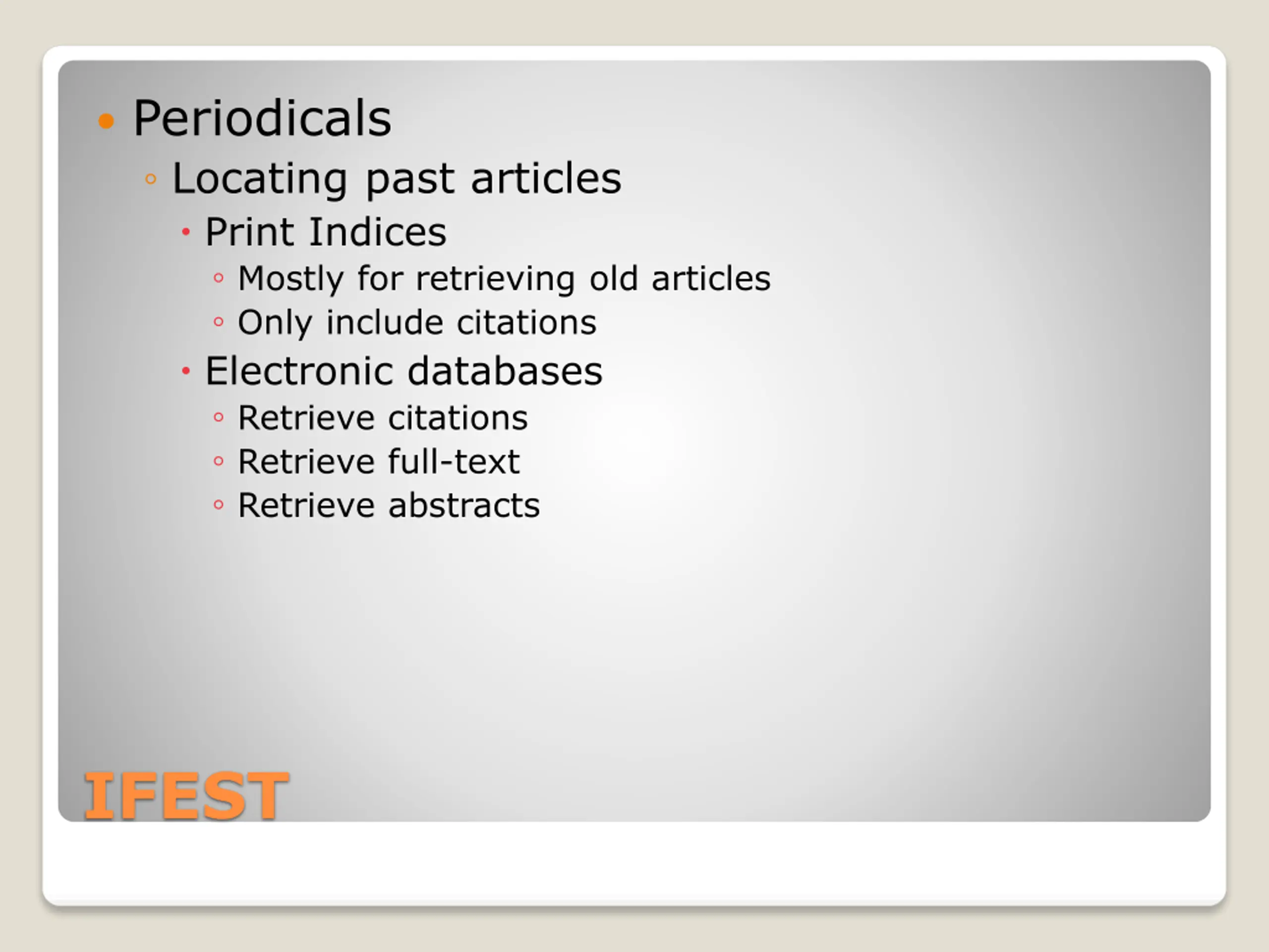 Periodicals Locating past articles Print Indices Mostly for retrieving old articles Only include citations Electronic databases Retrieve citations Retrieve full-text Retrieve abstracts IFEST