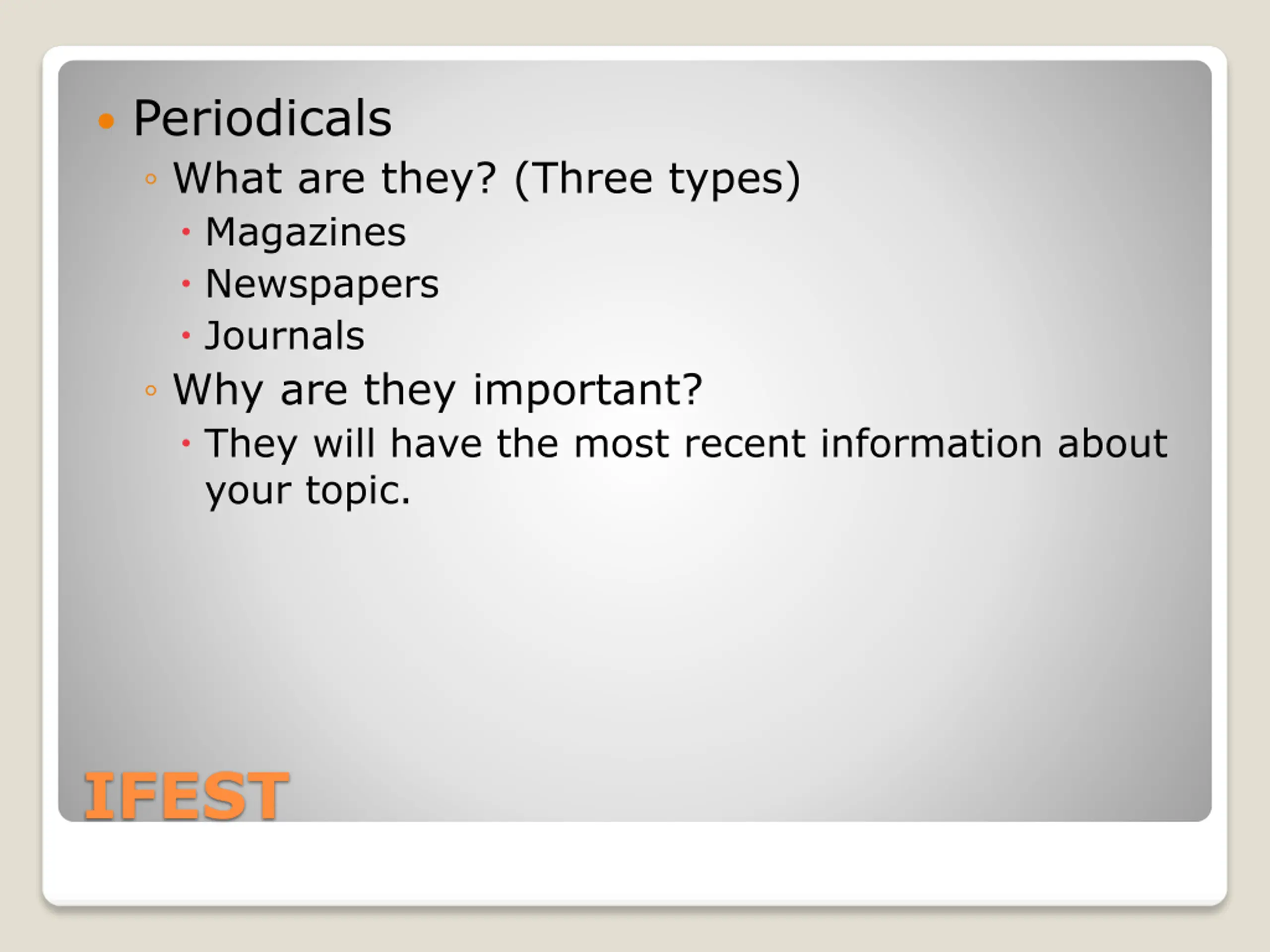 Periodicals What are they? (Three types) Magazines Newspapers Journals Why are they important? They will have the most recent information about your topic. IFEST