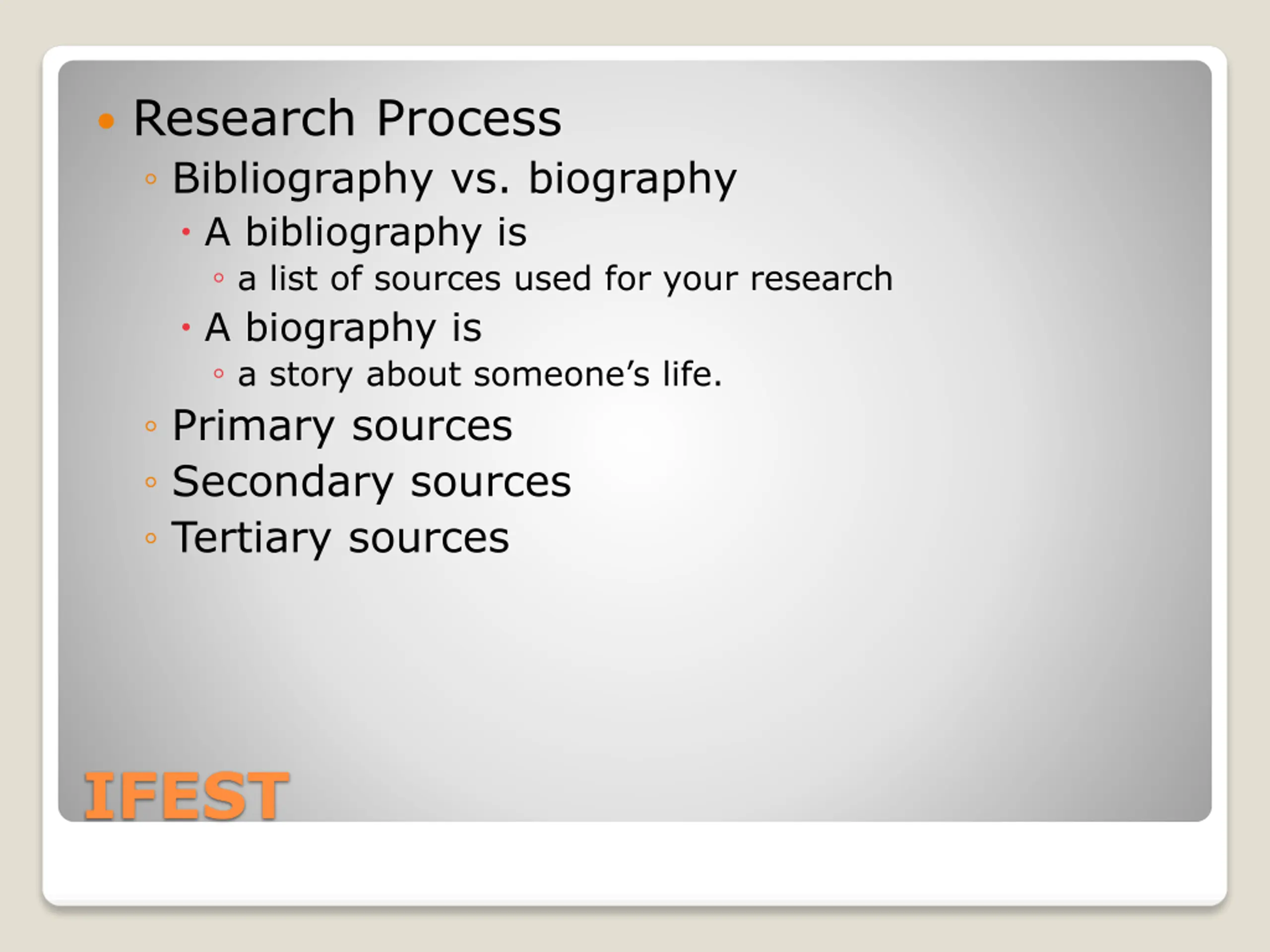 Research Process Bibliography vs. biography A bibliography is a list of sources used for your research A biography is a story about someone s life. Primary sources Secondary sources Tertiary sources IFEST
