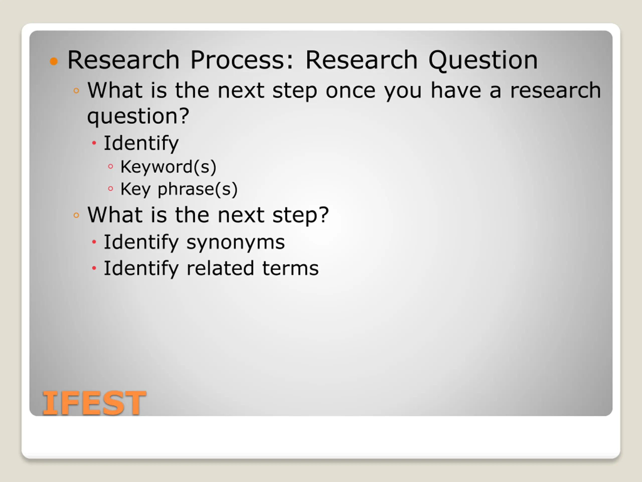 Research Process: Research Question What is the next step once you have a research question? Identify Keyword(s) Key phrase(s) What is the next step? Identify synonyms Identify related terms IFEST
