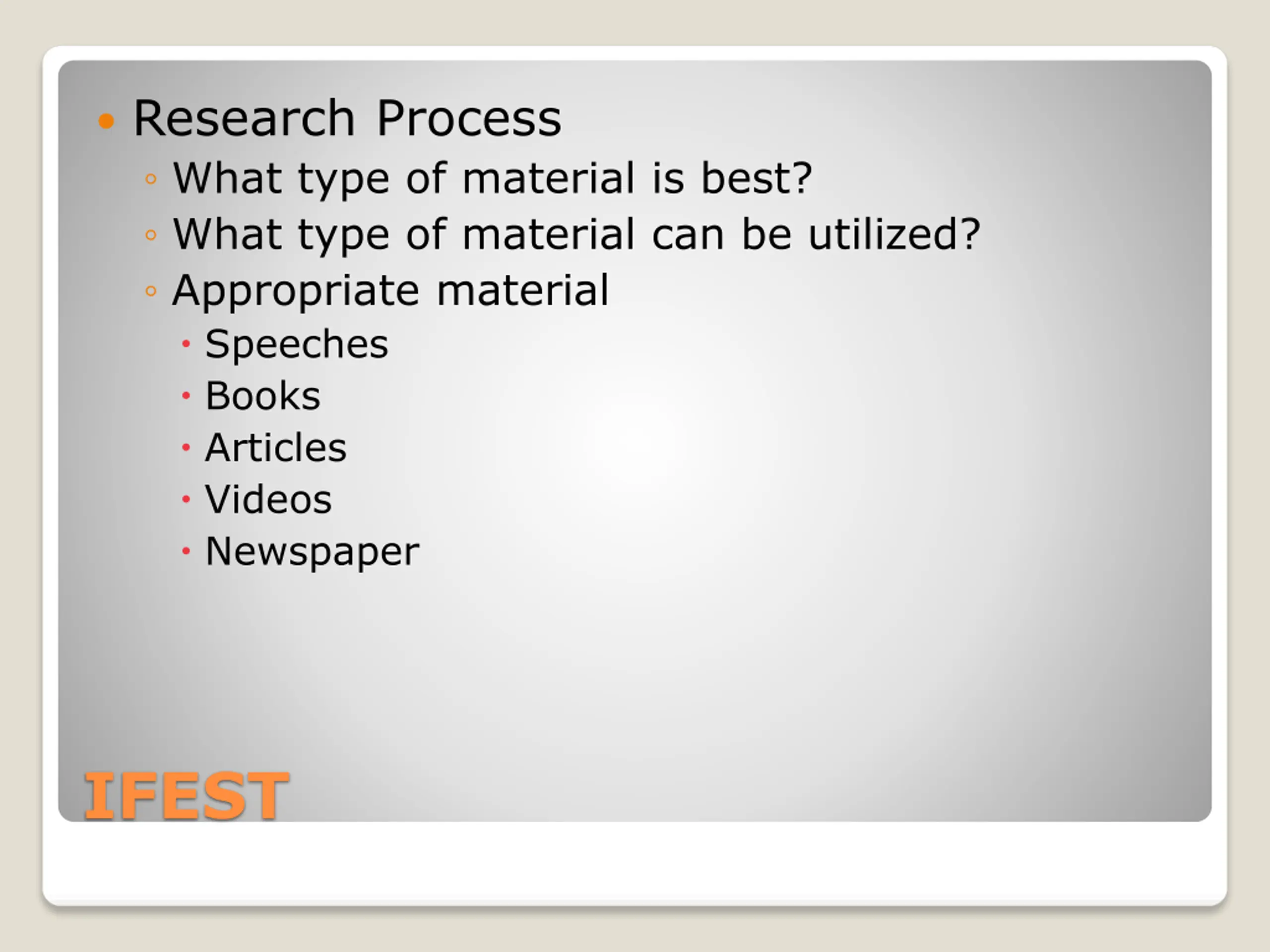 Research Process What type of material is best? What type of material can be utilized? Appropriate material Speeches Books Articles Videos Newspaper IFEST