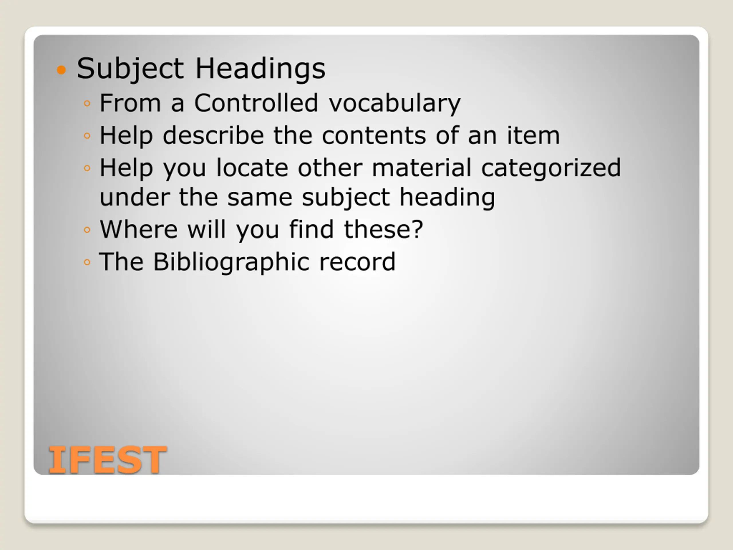 Subject Headings From a Controlled vocabulary Help describe the contents of an item Help you locate other material categorized under the same subject heading Where will you find these? The Bibliographic record IFEST
