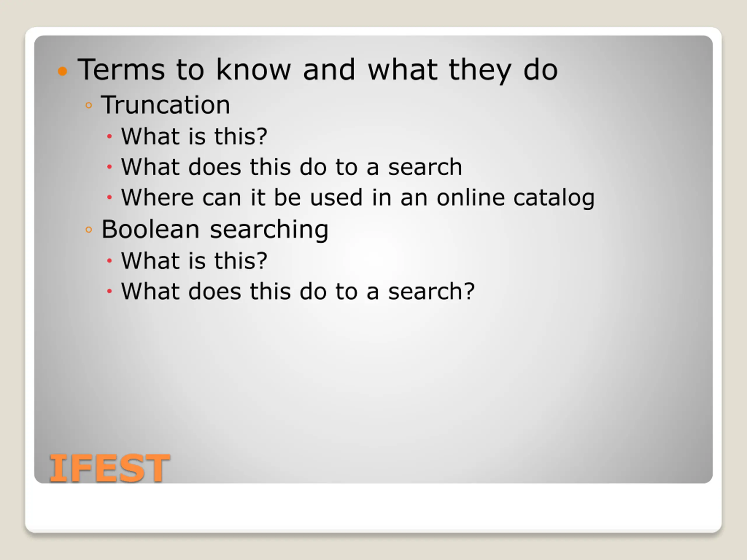 Terms to know and what they do Truncation What is this? What does this do to a search Where can it be used in an online catalog Boolean searching What is this? What does this do to a search? IFEST