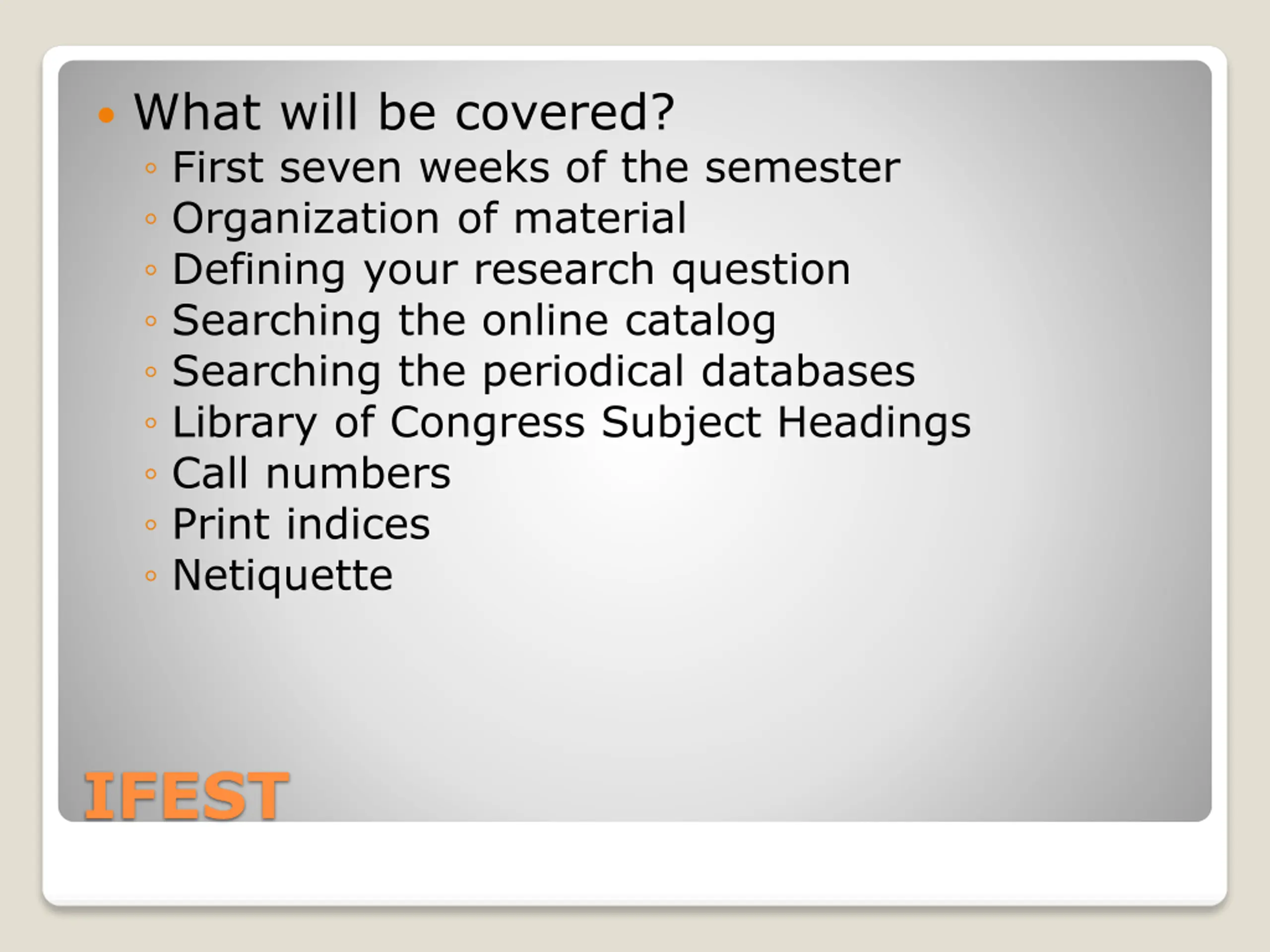 What will be covered? First seven weeks of the semester Organization of material Defining your research question Searching the online catalog Searching the periodical databases Library of Congress Subject Headings Call numbers Print indices Netiquette IFEST