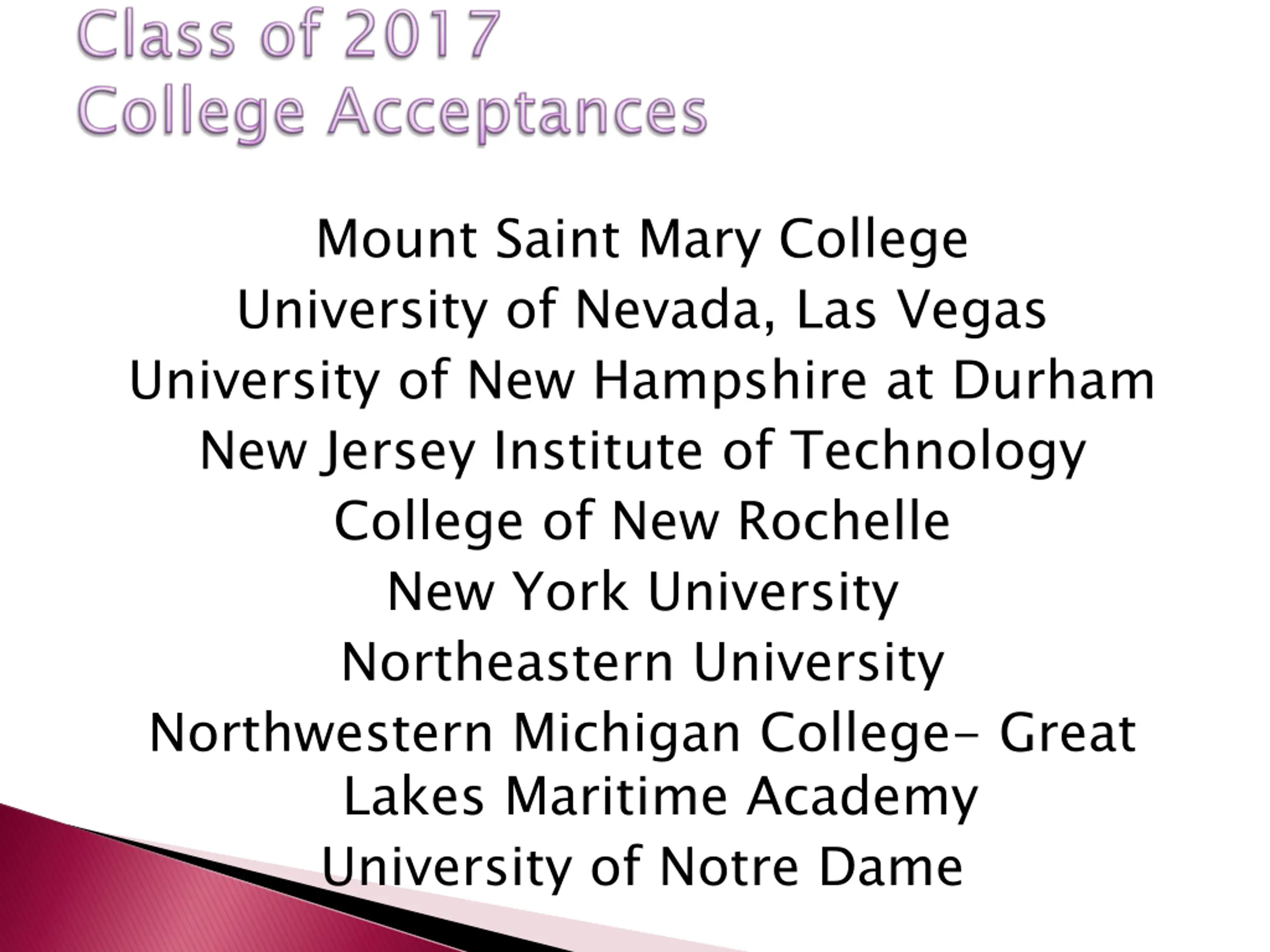 Mount Saint Mary College University of Nevada, Las Vegas University of New Hampshire at Durham New Jersey Institute of Technology College of New Rochelle New York University Northeastern University Northwestern Michigan College- Great Lakes Maritime Academy University of Notre Dame