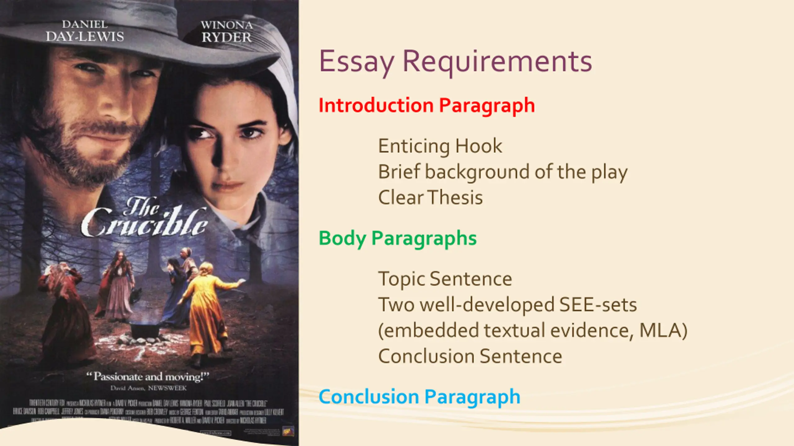 Essay Requirements Introduction Paragraph Enticing Hook Brief background of the play Clear Thesis Body Paragraphs Topic Sentence Two well-developed SEE-sets (embedded textual evidence, MLA) Conclusion Sentence Conclusion Paragraph