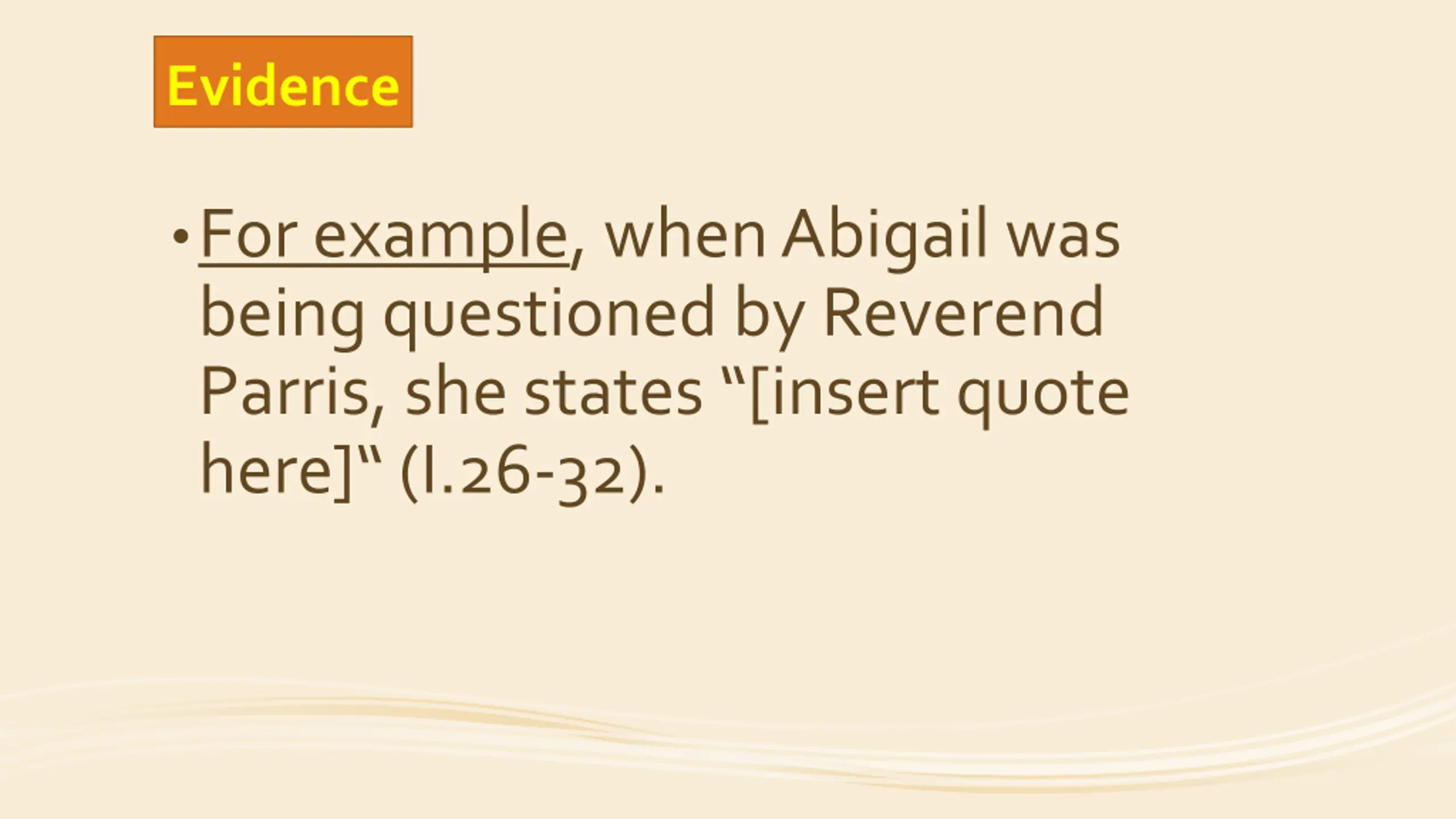 Evidence For example, when Abigail was being questioned by Reverend Parris, she states [insert quote here] (I.26-32).