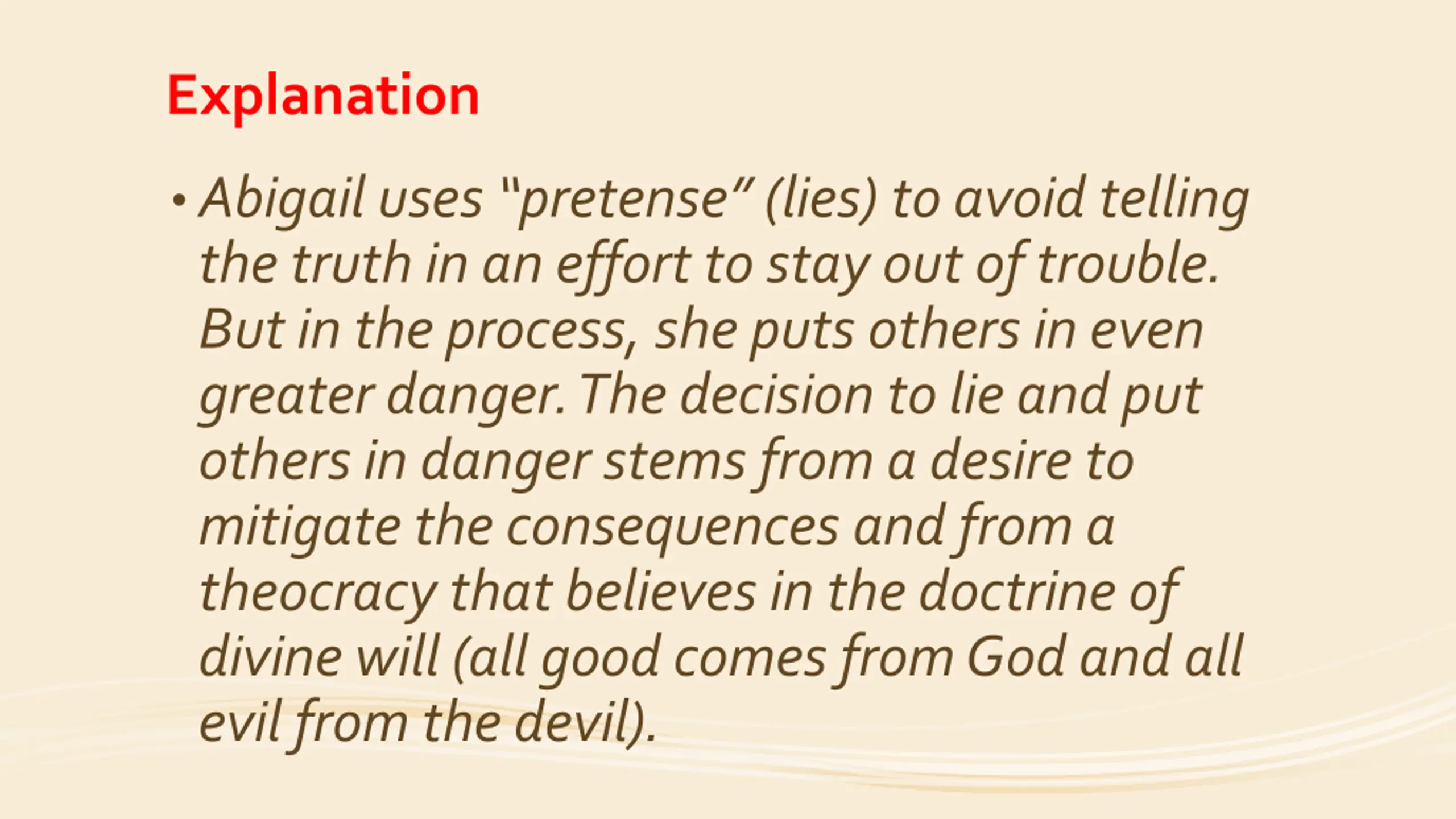 Explanation Abigail uses pretense (lies) to avoid telling the truth in an effort to stay out of trouble. But in the process, she puts others in even greater danger. The decision to lie and put others in danger stems from a desire to mitigate the consequences and from a theocracy that believes in the doctrine of divine will (all good comes from God and all evil from the devil).