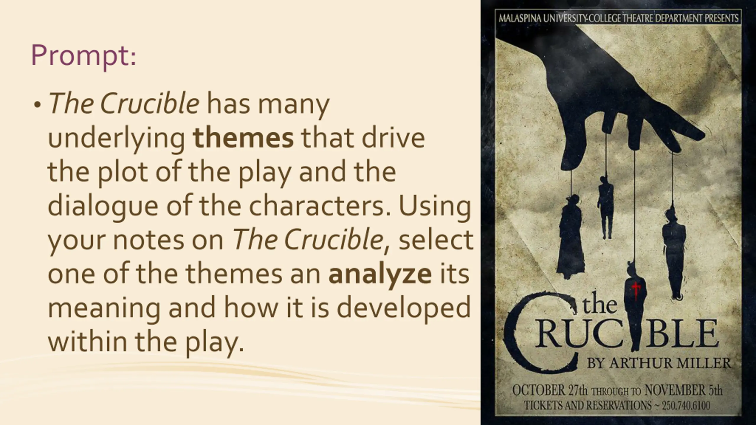 Prompt: The Crucible has many underlying themes that drive the plot of the play and the dialogue of the characters. Using your notes on The Crucible, select one of the themes an analyze its meaning and how it is developed within the play.