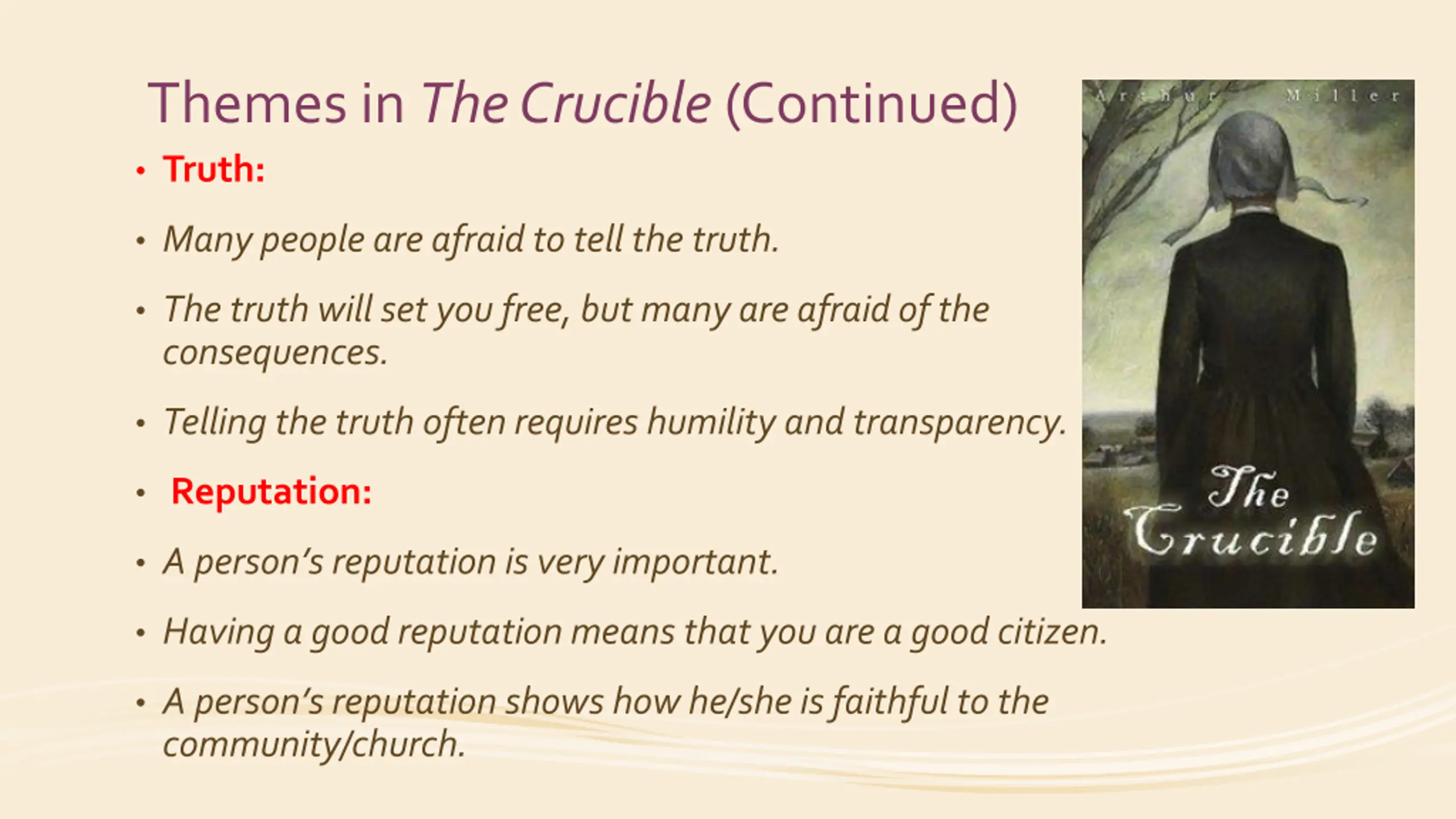 Themes in The Crucible (Continued) Truth: Many people are afraid to tell the truth. The truth will set you free, but many are afraid of the consequences. Telling the truth often requires humility and transparency. Reputation: A person s reputation is very important. Having a good reputation means that you are a good citizen. A person s reputation shows how he/she is faithful to the community/church.