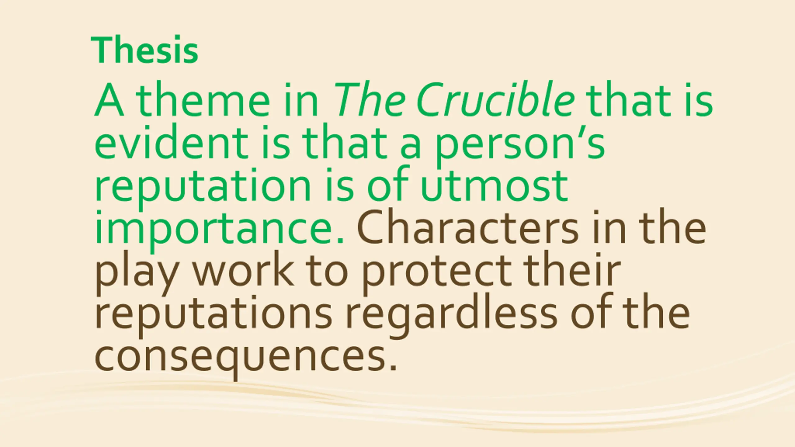 Thesis A theme in The Crucible that is evident is that a person s reputation is of utmost importance. Characters in the play work to protect their reputations regardless of the consequences.