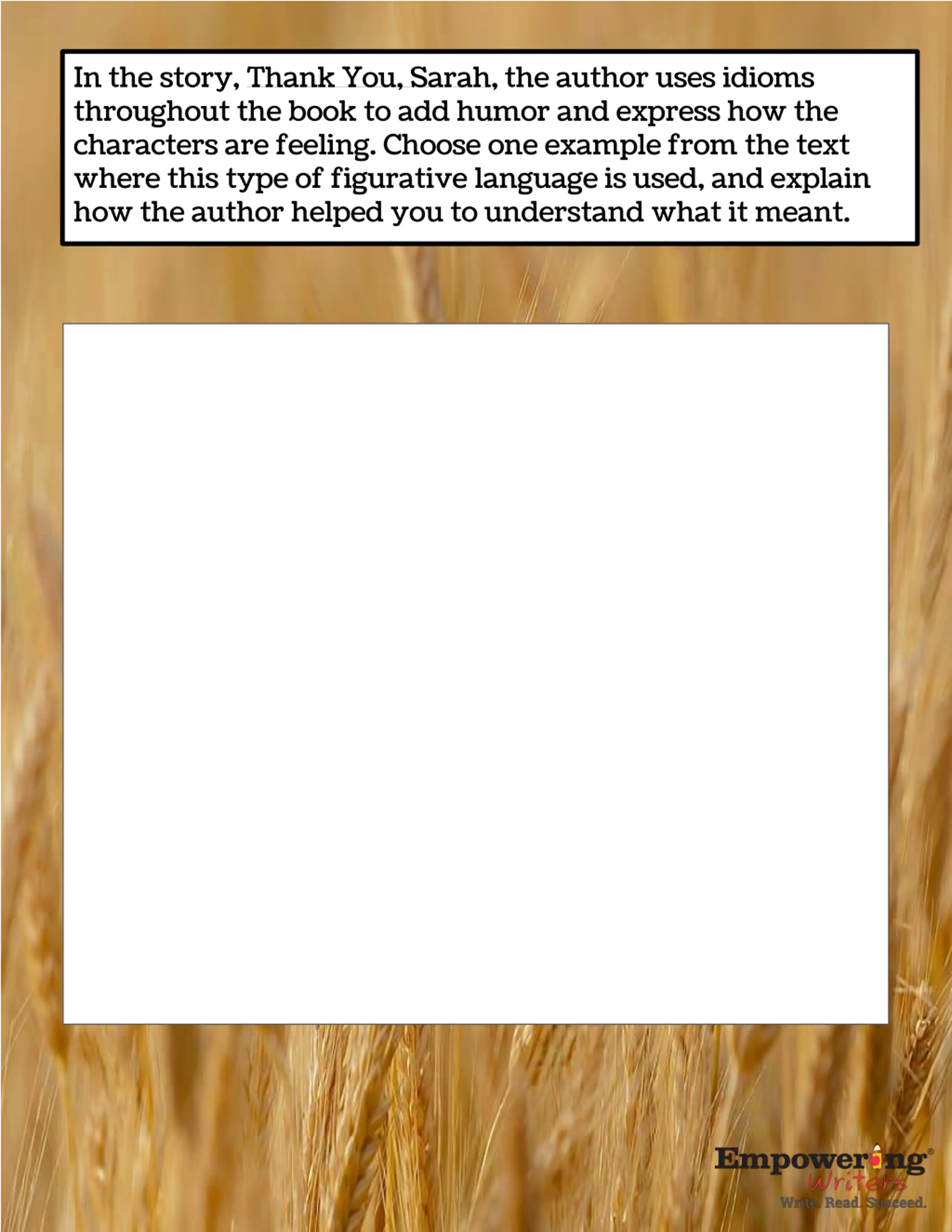 In the story, Thank You, Sarah, the author uses idioms throughout the book to add humor and express how the characters are feeling. Choose one example from the text where this type of figurative language is used, and explain how the author helped you to understand what it meant.