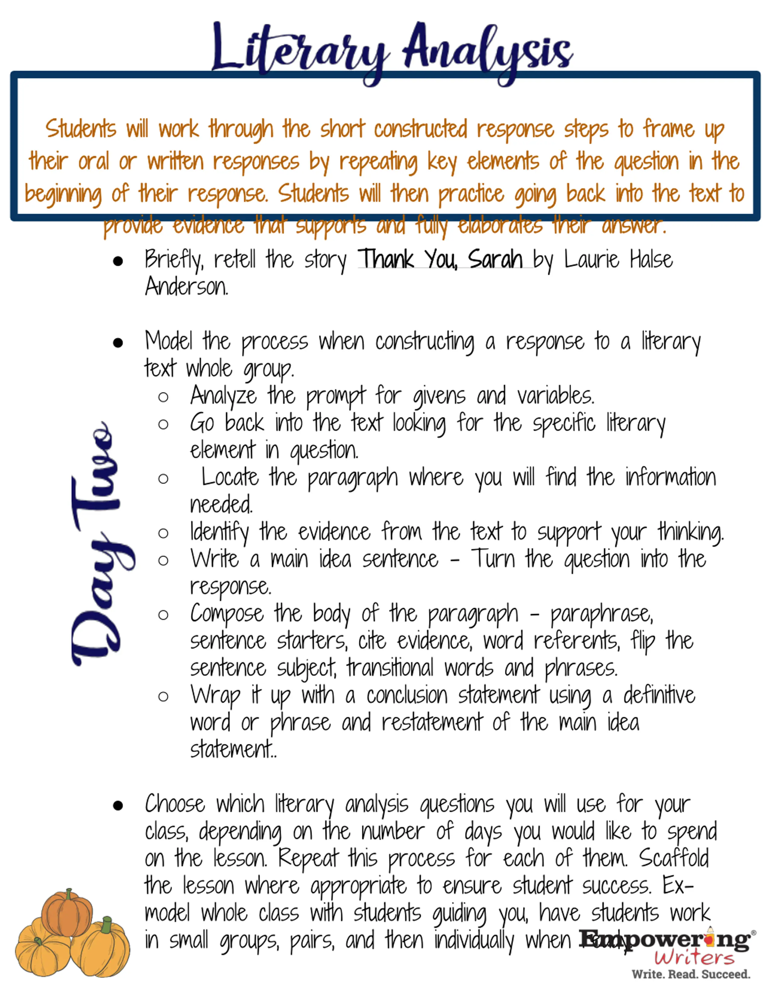 Students will work through the short constructed response steps to frame up Students will work through the short constructed response steps to frame up their oral or written responses by repeating key elements of the question in the their oral or written responses by repeating key elements of the question in the beginning of their response. Students will then practice going back into the text to beginning of their response. Students will then practice going back into the text to provide evidence that supports and fully elaborates their answer. provide evidence that supports and fully elaborates their answer. Briefly, retell the story Thank You, Sarah Thank You, Sarah by Laurie Halse Anderson. Model the process when constructing a response to a literary text whole group. Analyze the prompt for givens and variables. Go back into the text looking for the specific literary element in question. Locate the paragraph where you will find the information needed. Identify the evidence from the text to support your thinking. Write a main idea sentence - Turn the question into the response. Compose the body of the paragraph - paraphrase, sentence starters, cite evidence, word referents, flip the sentence subject, transitional words and phrases. Wrap it up with a conclusion statement using a definitive word or phrase and restatement of the main idea statement.. Choose which literary analysis questions you will use for your class, depending on the number of days you would like to spend on the lesson. Repeat this process for each of them. Scaffold the lesson where appropriate to ensure student success. Ex- model whole class with students guiding you, have students work in small groups, pairs, and then individually when ready.