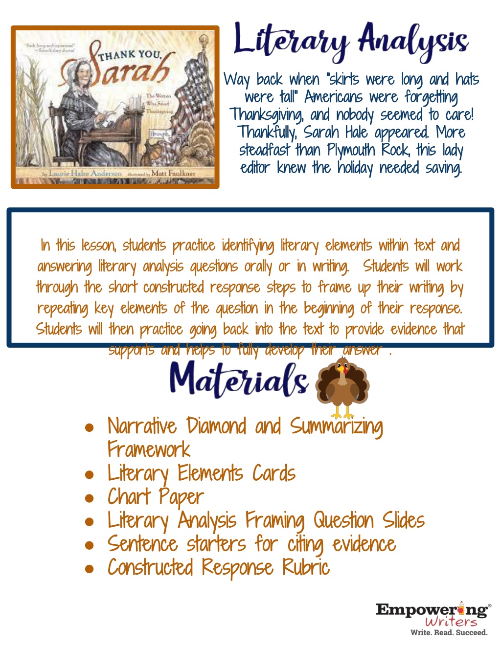 Way back when "skirts were long and hats Way back when "skirts were long and hats were tall" Americans were forgetting were tall" Americans were forgetting Thanksgiving, and nobody seemed to care! Thanksgiving, and nobody seemed to care! Thankfully, Sarah Hale appeared. More Thankfully, Sarah Hale appeared. More steadfast than Plymouth Rock, this lady steadfast than Plymouth Rock, this lady editor knew the holiday needed saving. editor knew the holiday needed saving. In this lesson, students practice identifying literary elements within text and In this lesson, students practice identifying literary elements within text and answering literary analysis questions orally or in writing. Students will work answering literary analysis questions orally or in writing. Students will work through the short constructed response steps to frame up their writing by through the short constructed response steps to frame up their writing by repeating key elements of the question in the beginning of their response. repeating key elements of the question in the beginning of their response. Students will then practice going back into the text to provide evidence that Students will then practice going back into the text to provide evidence that supports and helps to fully develop their answer . supports and helps to fully develop their answer . Narrative Diamond and Summarizing Narrative Diamond and Summarizing Framework Framework Literary Elements Cards Literary Elements Cards Chart Paper Chart Paper Literary Analysis Framing Question Slides Literary Analysis Framing Question Slides Sentence starters for citing evidence Sentence starters for citing evidence Constructed Response Rubric Constructed Response Rubric