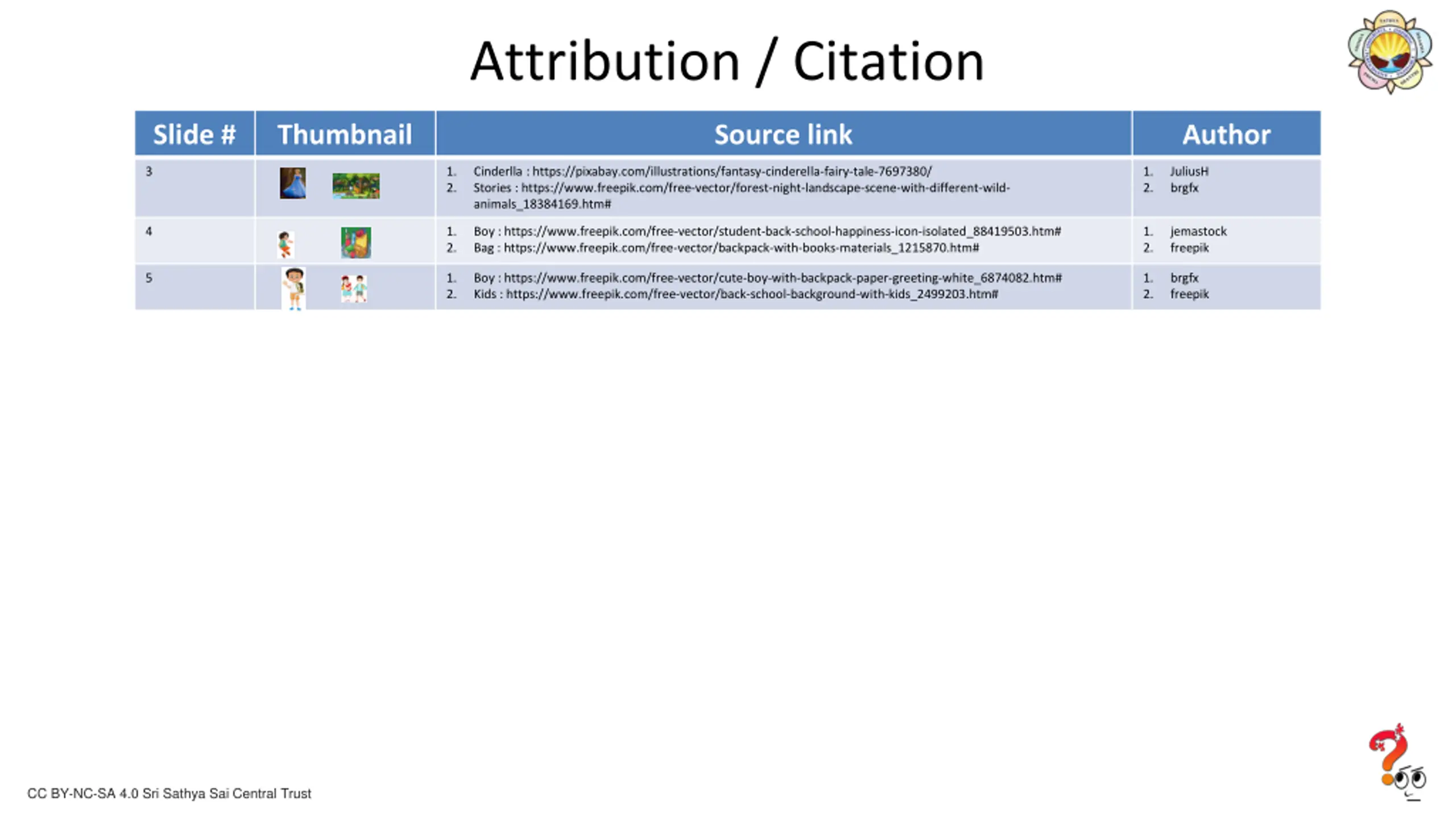 Attribution / Citation Slide # Thumbnail Source link Author 3 1. 2. Cinderlla : https://pixabay.com/illustrations/fantasy-cinderella-fairy-tale-7697380/ Stories : https://www.freepik.com/free-vector/forest-night-landscape-scene-with-different-wild- animals_18384169.htm# 1. 2. JuliusH brgfx 4 1. 2. Boy : https://www.freepik.com/free-vector/student-back-school-happiness-icon-isolated_88419503.htm# Bag : https://www.freepik.com/free-vector/backpack-with-books-materials_1215870.htm# 1. 2. jemastock freepik 5 1. 2. Boy : https://www.freepik.com/free-vector/cute-boy-with-backpack-paper-greeting-white_6874082.htm# Kids : https://www.freepik.com/free-vector/back-school-background-with-kids_2499203.htm# 1. 2. brgfx freepik CC BY-NC-SA 4.0 Sri Sathya Sai Central Trust