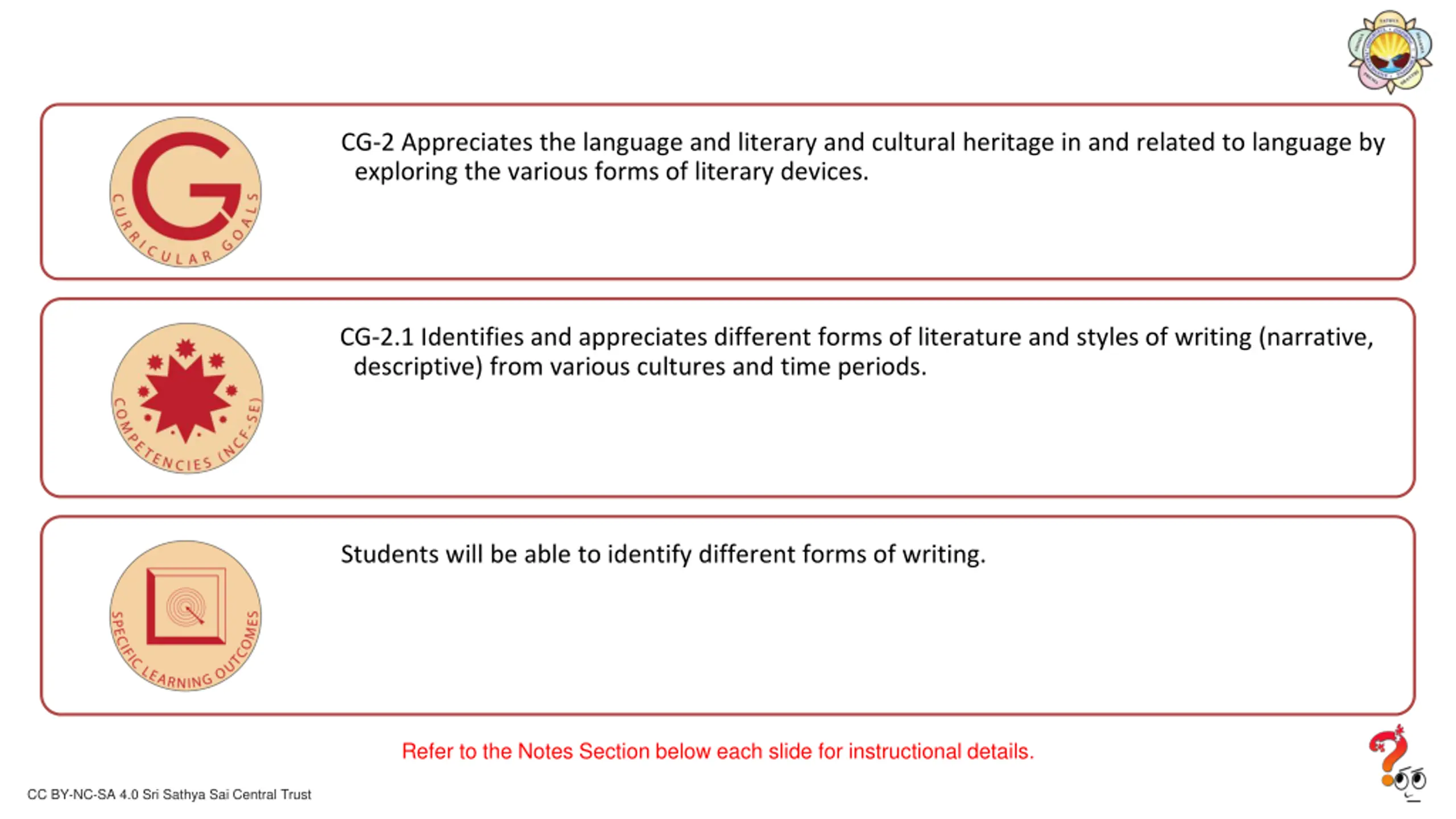 CG-2 Appreciates the language and literary and cultural heritage in and related to language by exploring the various forms of literary devices. CG-2.1 Identifies and appreciates different forms of literature and styles of writing (narrative, descriptive) from various cultures and time periods. Students will be able to identify different forms of writing. Refer to the Notes Section below each slide for instructional details. CC BY-NC-SA 4.0 Sri Sathya Sai Central Trust