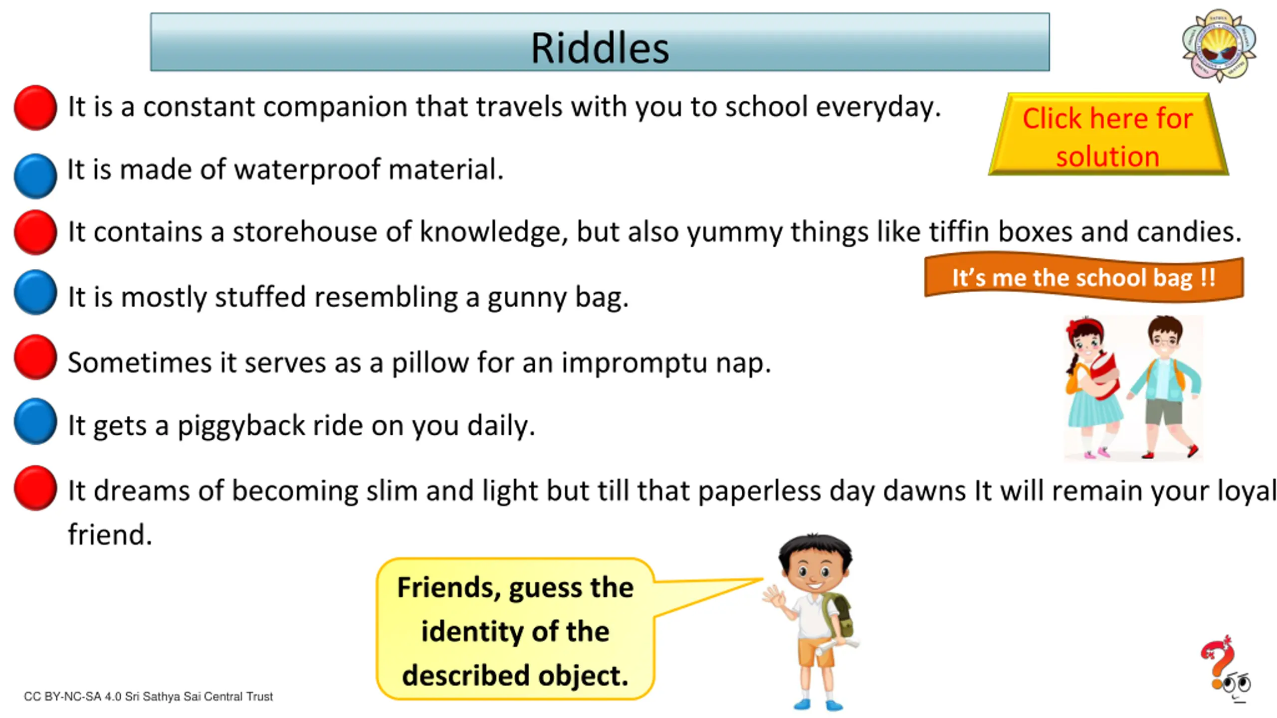 Riddles It is a constant companion that travels with you to school everyday. Click here for solution It is made of waterproof material. It contains a storehouse of knowledge, but also yummy things like tiffin boxes and candies. It s me the school bag !! It is mostly stuffed resembling a gunny bag. Sometimes it serves as a pillow for an impromptu nap. It gets a piggyback ride on you daily. It dreams of becoming slim and light but till that paperless day dawns It will remain your loyal friend. Friends, guess the identity of the described object. CC BY-NC-SA 4.0 Sri Sathya Sai Central Trust