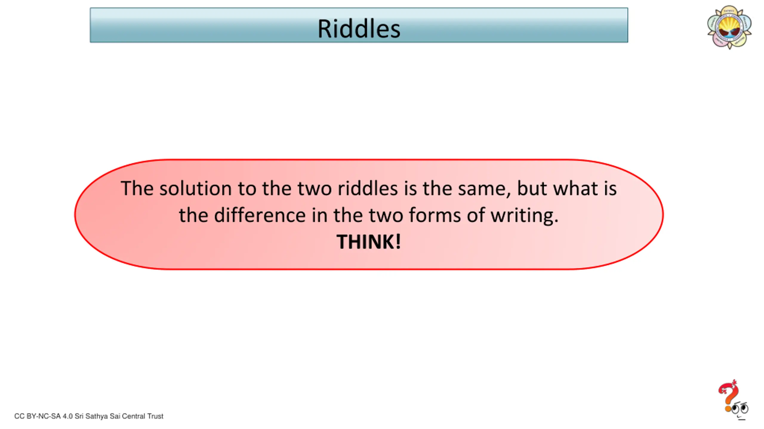 Riddles The solution to the two riddles is the same, but what is the difference in the two forms of writing. THINK! CC BY-NC-SA 4.0 Sri Sathya Sai Central Trust