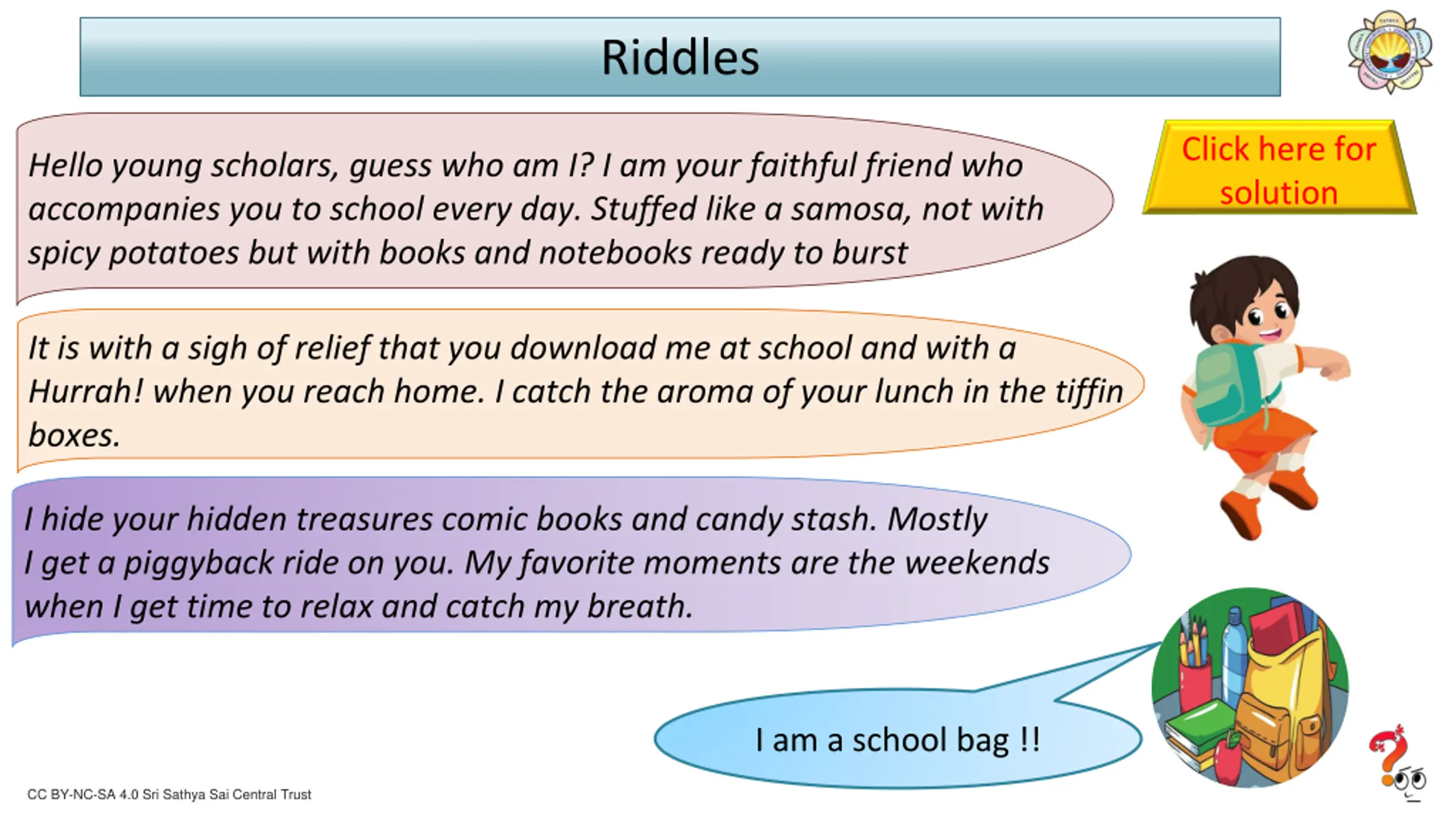 Riddles Click here for solution Hello young scholars, guess who am I? I am your faithful friend who accompanies you to school every day. Stuffed like a samosa, not with spicy potatoes but with books and notebooks ready to burst It is with a sigh of relief that you download me at school and with a Hurrah! when you reach home. I catch the aroma of your lunch in the tiffin boxes. I hide your hidden treasures comic books and candy stash. Mostly I get a piggyback ride on you. My favorite moments are the weekends when I get time to relax and catch my breath. I am a school bag !! CC BY-NC-SA 4.0 Sri Sathya Sai Central Trust
