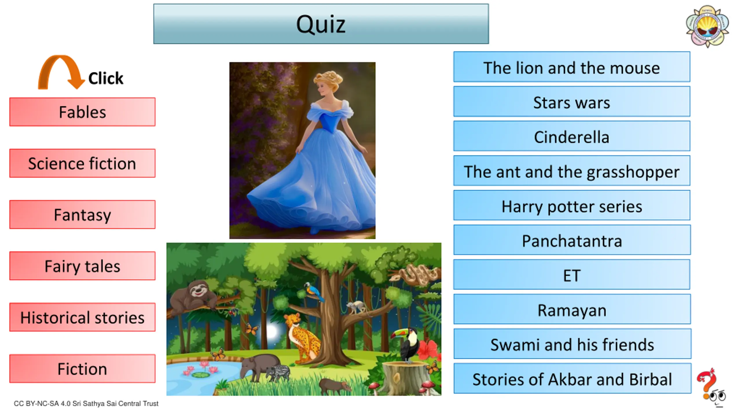 Quiz The lion and the mouse Click Stars wars Fables Cinderella Science fiction The ant and the grasshopper Harry potter series Fantasy Panchatantra Fairy tales ET Ramayan Historical stories Swami and his friends Fiction Stories of Akbar and Birbal CC BY-NC-SA 4.0 Sri Sathya Sai Central Trust