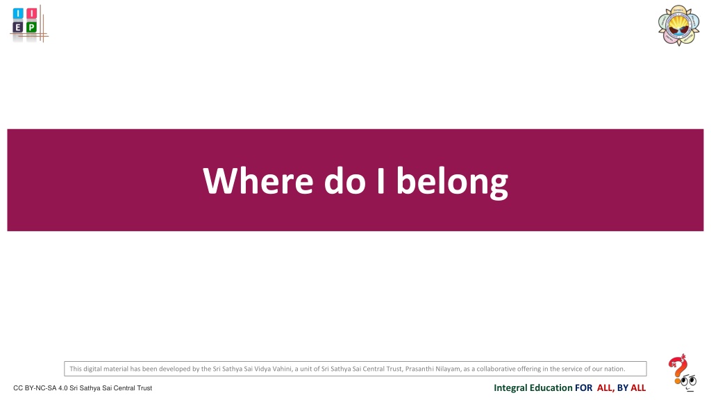 Where do I belong This digital material has been developed by the Sri Sathya Sai Vidya Vahini, a unit of Sri Sathya Sai Central Trust, Prasanthi Nilayam, as a collaborative offering in the service of our nation. Integral Education FOR ALL, BY ALL CC BY-NC-SA 4.0 Sri Sathya Sai Central Trust