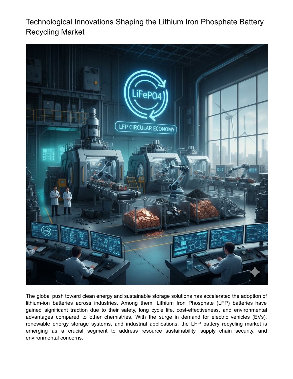 Technological Innovations Shaping the Lithium Iron Phosphate Battery Recycling Market The global push toward clean energy and sustainable storage solutions has accelerated the adoption of lithium-ion batteries across industries. Among them, Lithium Iron Phosphate (LFP) batteries have gained significant traction due to their safety, long cycle life, cost-effectiveness, and environmental advantages compared to other chemistries. With the surge in demand for electric vehicles (EVs), renewable energy storage systems, and industrial applications, the LFP battery recycling market is emerging as a crucial segment to address resource sustainability, supply chain security, and environmental concerns.
