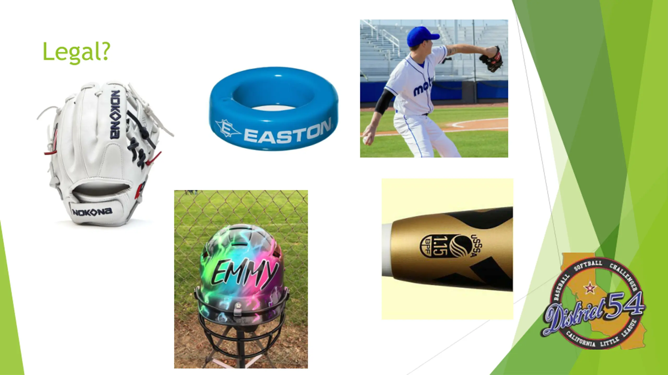 Objectives of the Game - 1.11 (b) - A league must provide each team with a distinctive uniform. Uniforms are the property of the league. Tee Ball/Minor League: T-shirts and caps/ visors are recommended, but hand-me-down uniforms may be worn. (c) - Sleeve lengths may vary for individual players, but the sleeves of each individual shall be approximately the same length. No player shall wear ragged, frayed, or slit sleeves. (d) - No players shall attach to a uniform tape or other material of a different color than the uniform. (e) - No part of the uniform shall include a pattern that imitates or suggests the shape of a (baseball or softball). (f) - Glass buttons and polished metal shall not be used on a uniform. (g) - No player shall attach anything to the heel or toe of the shoe other than a toe plate.