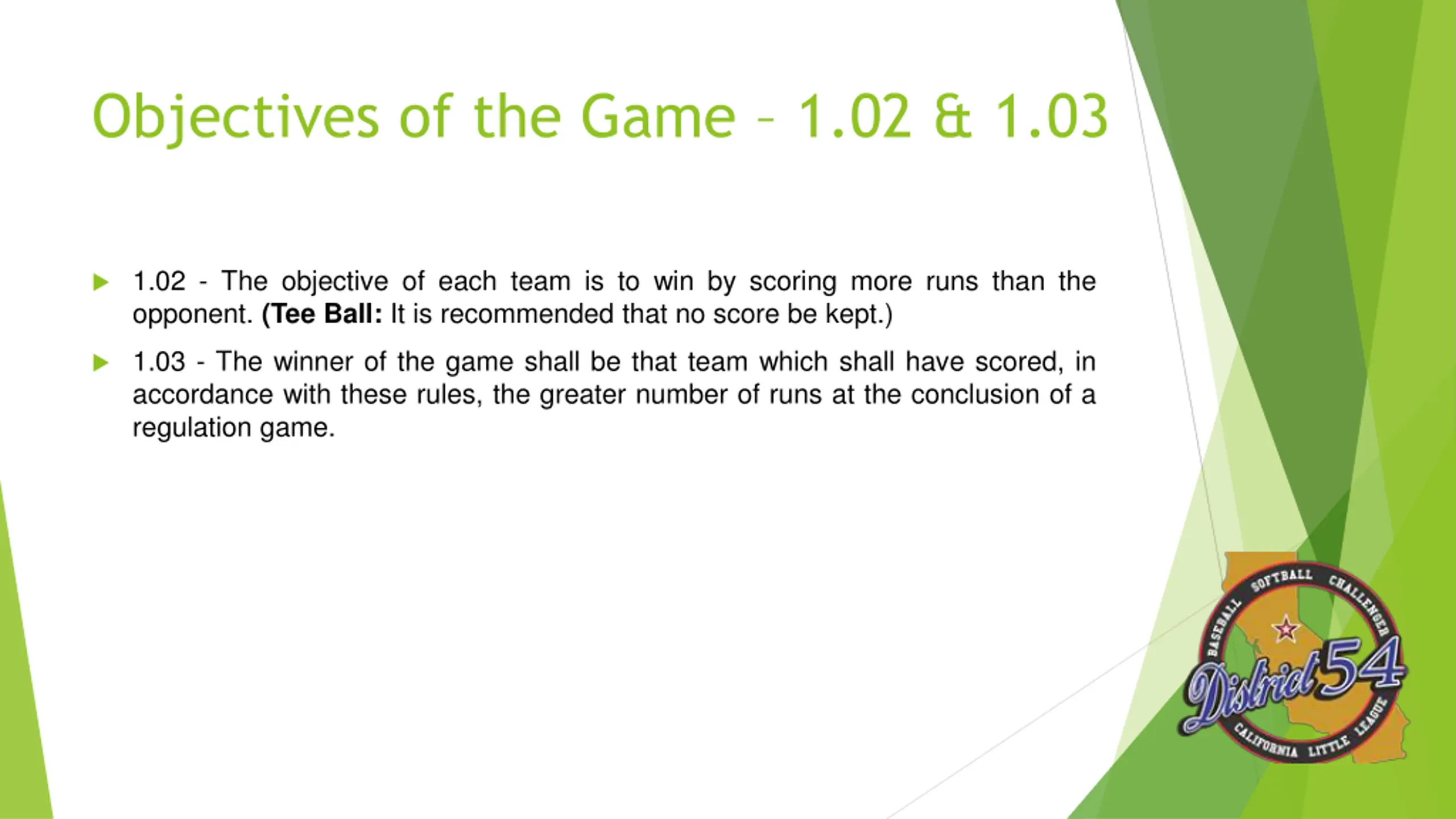 Objectives of the Game 1.02 & 1.03 1.02 - The objective of each team is to win by scoring more runs than the opponent. (Tee Ball: It is recommended that no score be kept.) 1.03 - The winner of the game shall be that team which shall have scored, in accordance with these rules, the greater number of runs at the conclusion of a regulation game.