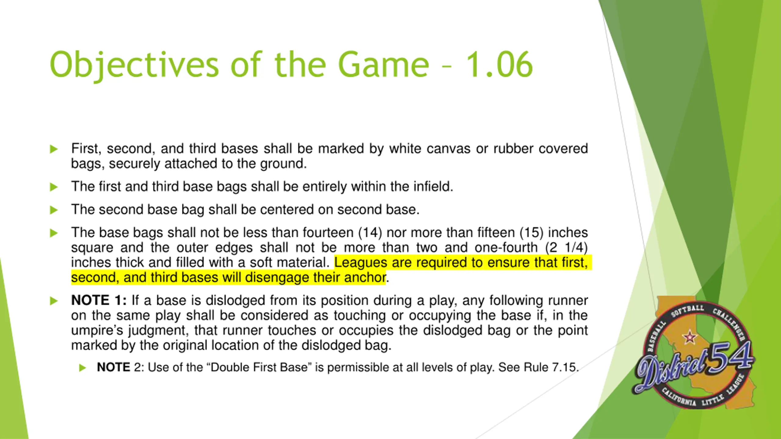 Objectives of the Game 1.06 First, second, and third bases shall be marked by white canvas or rubber covered bags, securely attached to the ground. The first and third base bags shall be entirely within the infield. The second base bag shall be centered on second base. The base bags shall not be less than fourteen (14) nor more than fifteen (15) inches square and the outer edges shall not be more than two and one-fourth (2 1/4) inches thick and filled with a soft material. Leagues are required to ensure that first, second, and third bases will disengage their anchor. NOTE 1: If a base is dislodged from its position during a play, any following runner on the same play shall be considered as touching or occupying the base if, in the umpire s judgment, that runner touches or occupies the dislodged bag or the point marked by the original location of the dislodged bag. NOTE 2: Use of the Double First Base is permissible at all levels of play. See Rule 7.15.