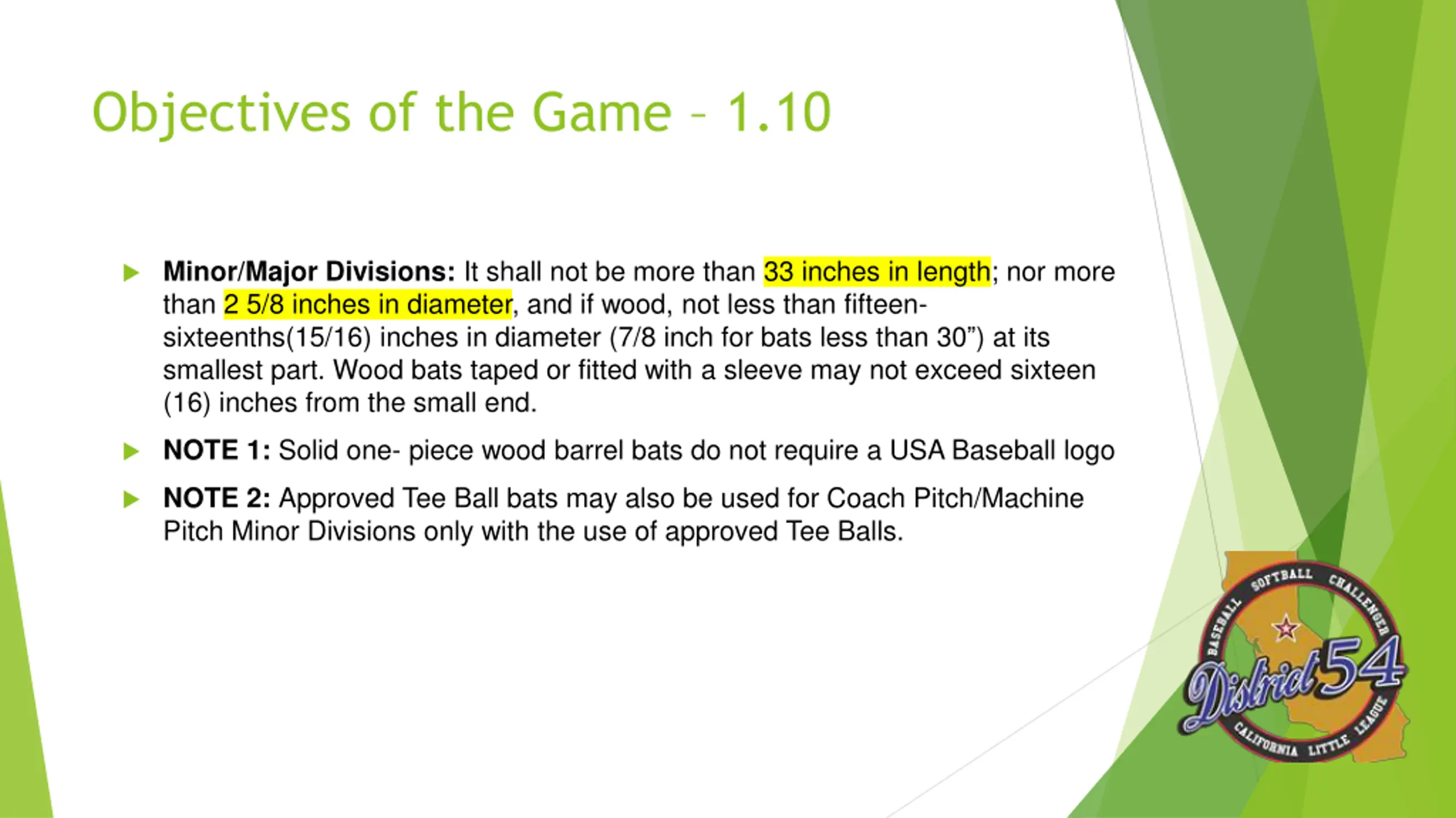Objectives of the Game 1.10 Minor/Major Divisions: It shall not be more than 33 inches in length; nor more than 2 5/8 inches in diameter, and if wood, not less than fifteen- sixteenths(15/16) inches in diameter (7/8 inch for bats less than 30 ) at its smallest part. Wood bats taped or fitted with a sleeve may not exceed sixteen (16) inches from the small end. NOTE 1: Solid one- piece wood barrel bats do not require a USA Baseball logo NOTE 2: Approved Tee Ball bats may also be used for Coach Pitch/Machine Pitch Minor Divisions only with the use of approved Tee Balls.