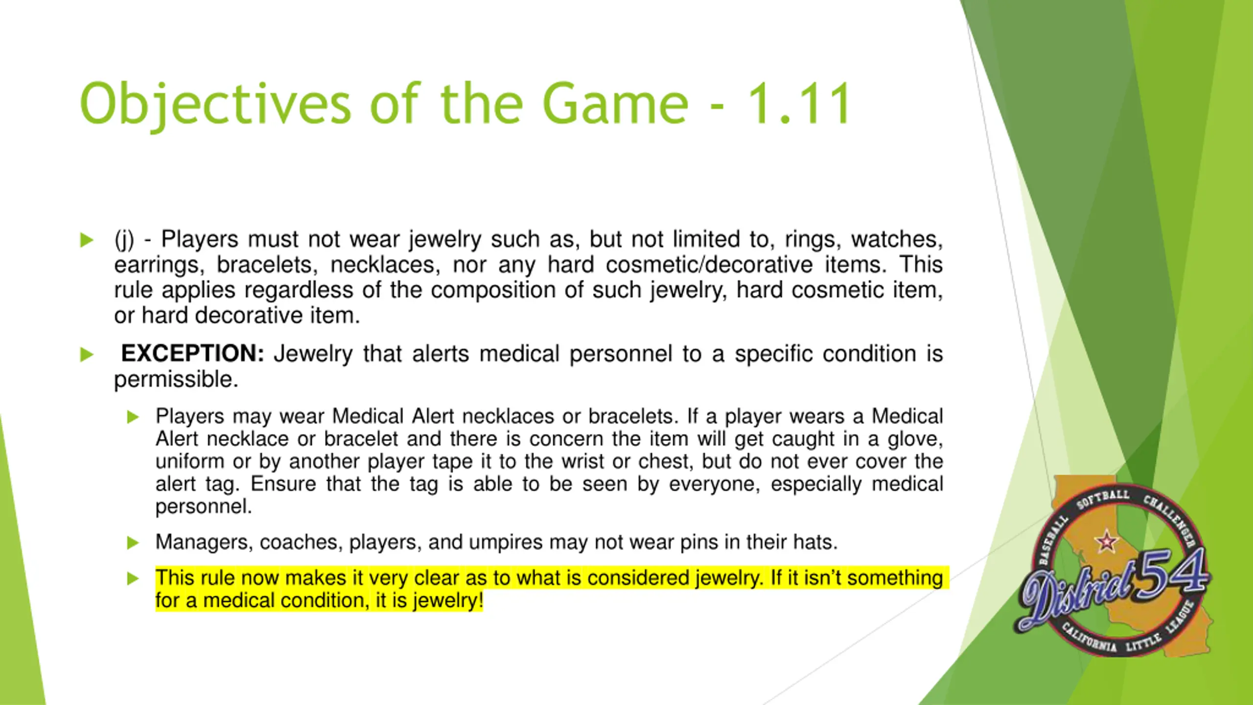 Objectives of the Game - 1.11 (j) - Players must not wear jewelry such as, but not limited to, rings, watches, earrings, bracelets, necklaces, nor any hard cosmetic/decorative items. This rule applies regardless of the composition of such jewelry, hard cosmetic item, or hard decorative item. EXCEPTION: Jewelry that alerts medical personnel to a specific condition is permissible. Players may wear Medical Alert necklaces or bracelets. If a player wears a Medical Alert necklace or bracelet and there is concern the item will get caught in a glove, uniform or by another player tape it to the wrist or chest, but do not ever cover the alert tag. Ensure that the tag is able to be seen by everyone, especially medical personnel. Managers, coaches, players, and umpires may not wear pins in their hats. This rule now makes it very clear as to what is considered jewelry. If it isn t something for a medical condition, it is jewelry!