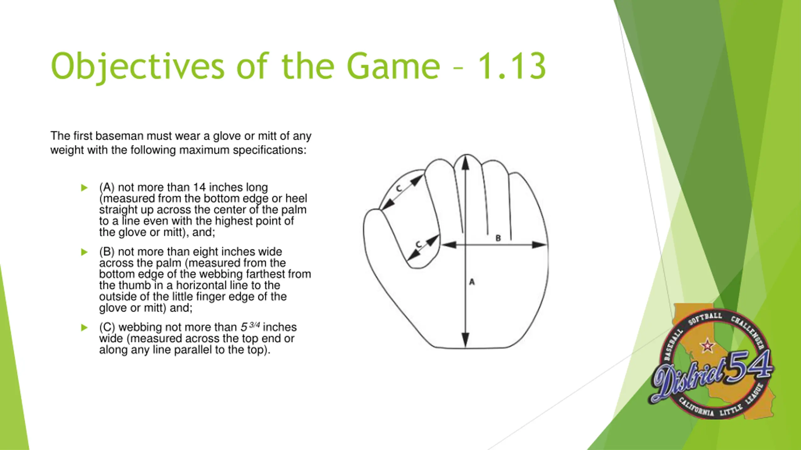 Objectives of the Game 1.13 The first baseman must wear a glove or mitt of any weight with the following maximum specifications: (A) not more than 14 inches long (measured from the bottom edge or heel straight up across the center of the palm to a line even with the highest point of the glove or mitt), and; (B) not more than eight inches wide across the palm (measured from the bottom edge of the webbing farthest from the thumb in a horizontal line to the outside of the little finger edge of the glove or mitt) and; (C) webbing not more than 53/4inches wide (measured across the top end or along any line parallel to the top).