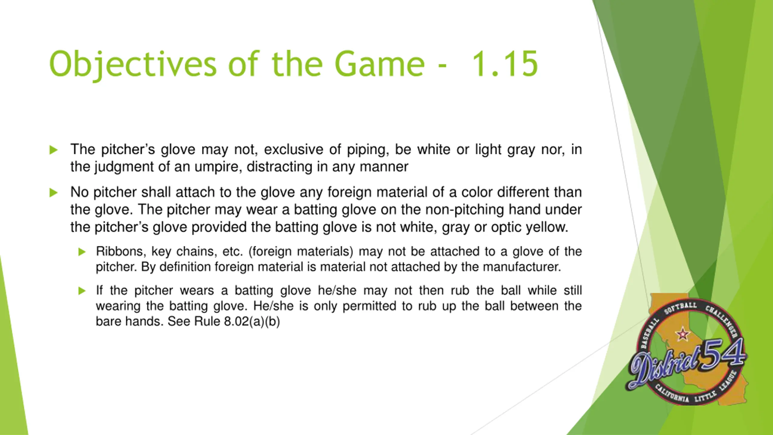 Objectives of the Game - 1.15 The pitcher s glove may not, exclusive of piping, be white or light gray nor, in the judgment of an umpire, distracting in any manner No pitcher shall attach to the glove any foreign material of a color different than the glove. The pitcher may wear a batting glove on the non-pitching hand under the pitcher s glove provided the batting glove is not white, gray or optic yellow. Ribbons, key chains, etc. (foreign materials) may not be attached to a glove of the pitcher. By definition foreign material is material not attached by the manufacturer. If the pitcher wears a batting glove he/she may not then rub the ball while still wearing the batting glove. He/she is only permitted to rub up the ball between the bare hands. See Rule 8.02(a)(b)