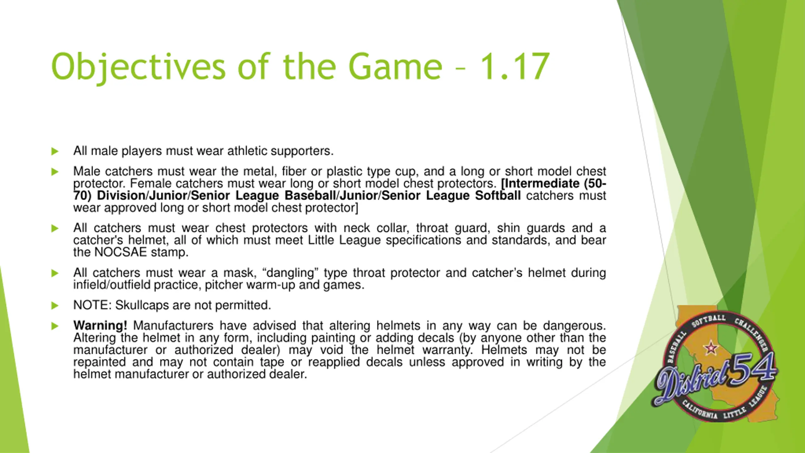 Objectives of the Game 1.17 All male players must wear athletic supporters. Male catchers must wear the metal, fiber or plastic type cup, and a long or short model chest protector. Female catchers must wear long or short model chest protectors. [Intermediate (50- 70) Division/Junior/Senior League Baseball/Junior/Senior League Softball catchers must wear approved long or short model chest protector] All catchers must wear chest protectors with neck collar, throat guard, shin guards and a catcher's helmet, all of which must meet Little League specifications and standards, and bear the NOCSAE stamp. All catchers must wear a mask, dangling type throat protector and catcher s helmet during infield/outfield practice, pitcher warm-up and games. NOTE: Skullcaps are not permitted. Warning! Manufacturers have advised that altering helmets in any way can be dangerous. Altering the helmet in any form, including painting or adding decals (by anyone other than the manufacturer or authorized dealer) may void the helmet warranty. Helmets may not be repainted and may not contain tape or reapplied decals unless approved in writing by the helmet manufacturer or authorized dealer.